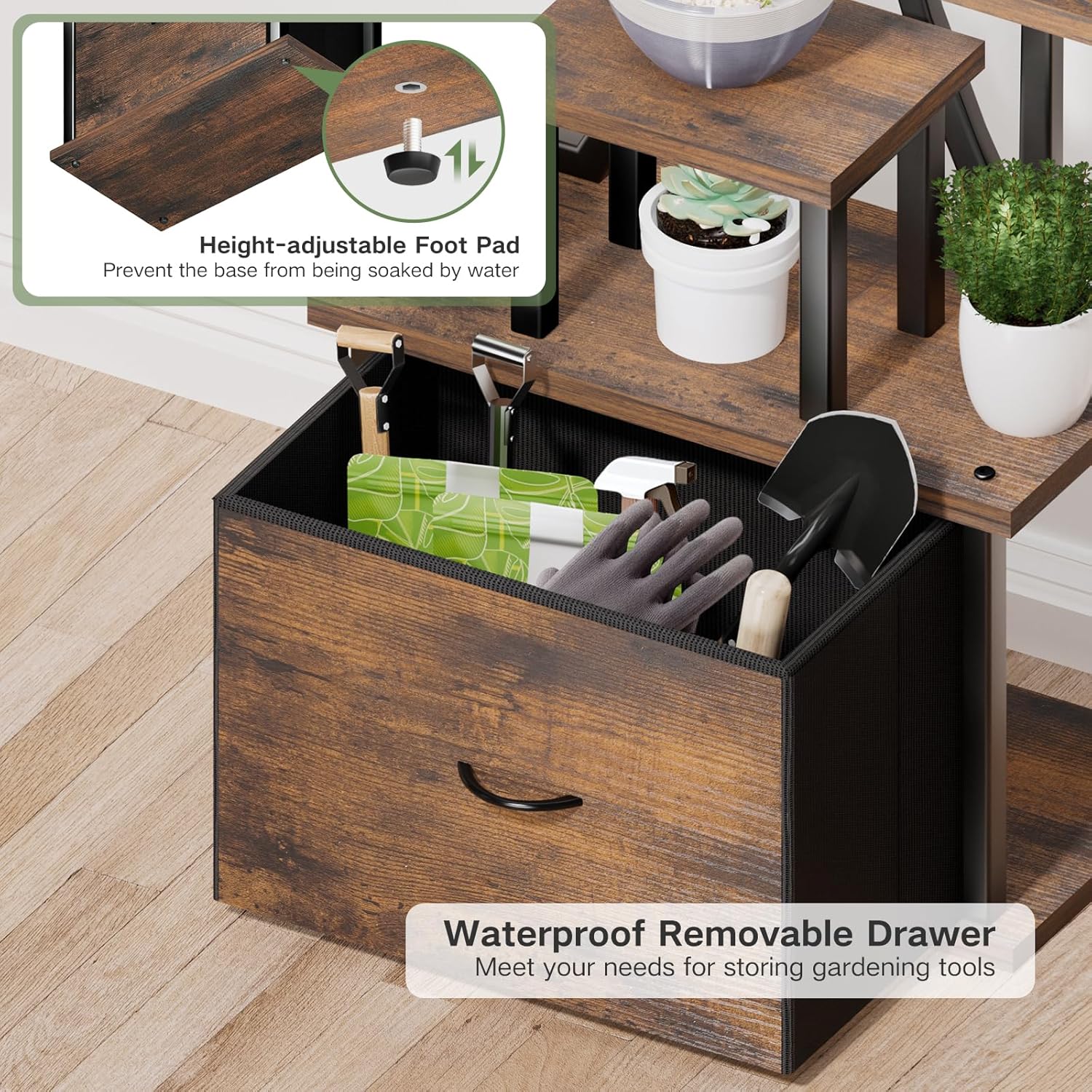 - 【Space-Saving Design】The 65" tall plant stand indoor with 9 staggered tiers, 9 pot stands, which can easily accommodate large potted plants, small succulents or home decorations, helping you save floor space while fully displaying plant collection. Our upgraded plant shelf with grow light have a removable waterproof drawer to store your gardening tools. The bottom is equipped with non-slip adjustable-height feet pads to adapt to uneven ground, and enhance the stability of the plant holder.