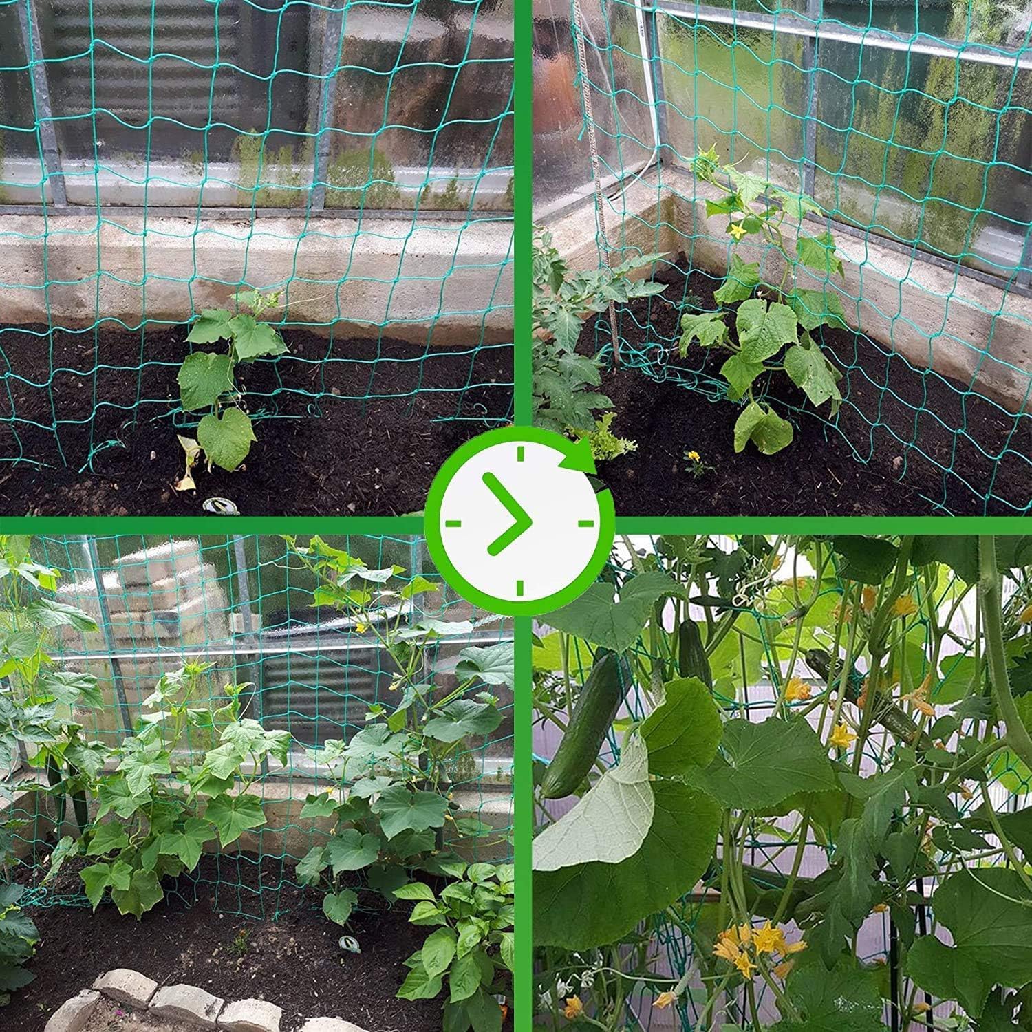- HIGH QUALITY: Made from Sturdy, All-Weather heavy duty nylon netting is strong and has not torn. Strong reaking strength supports extremely heavy crop loads. This green plastic material resists UV rays and numerous types of chemicals. It is also aseptic. You can reuse or recycle the netting after harvest. These features make it the most efficient and cost-effective way to support your climbing plants!