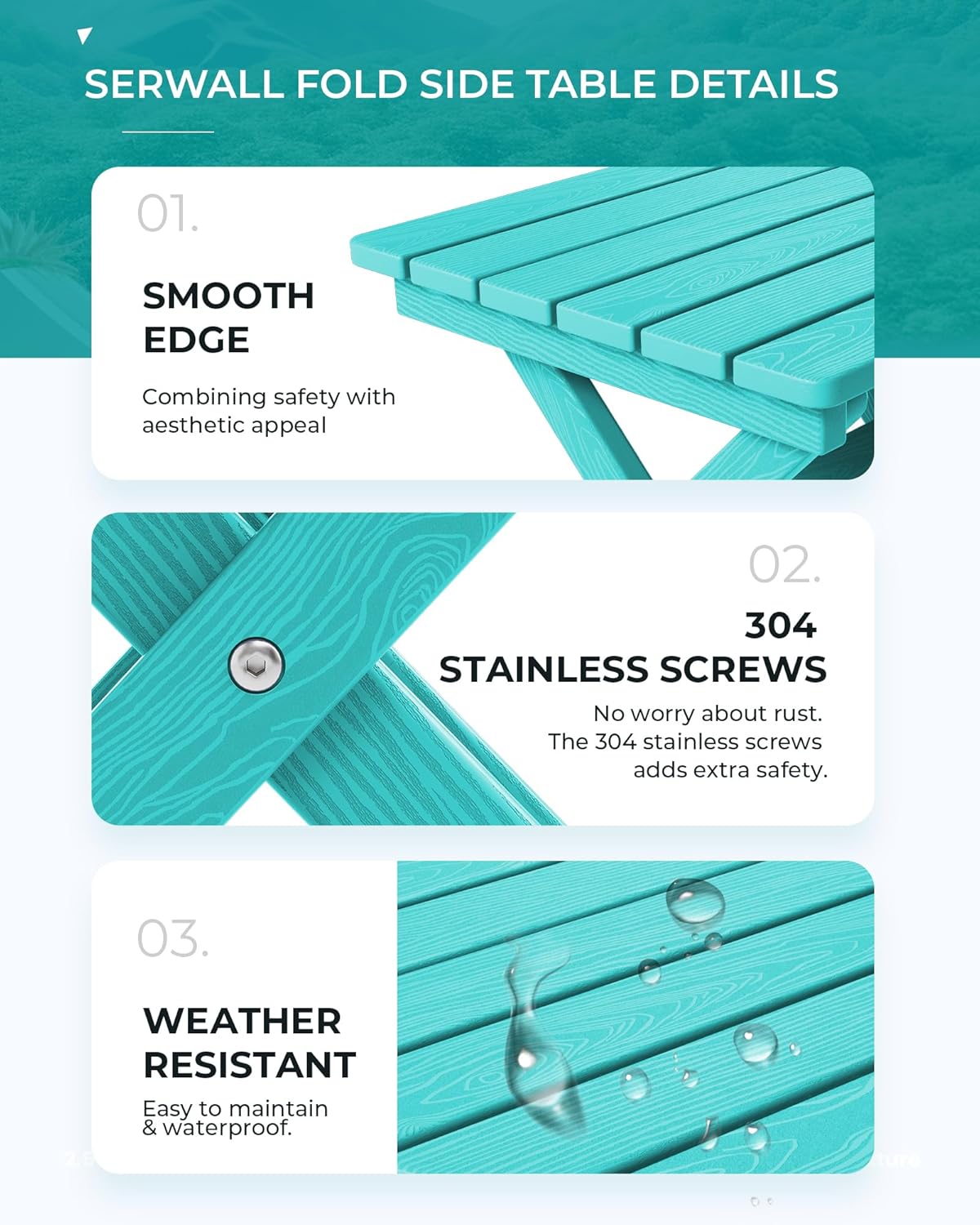 - [Ready-to-Use Convenience] Unbox your SERWALL Adirondack Side Table and enjoy immediate functionality. This folding end table is designed for hassle-free setup, perfect for those seeking a no-assembly-required experience.
