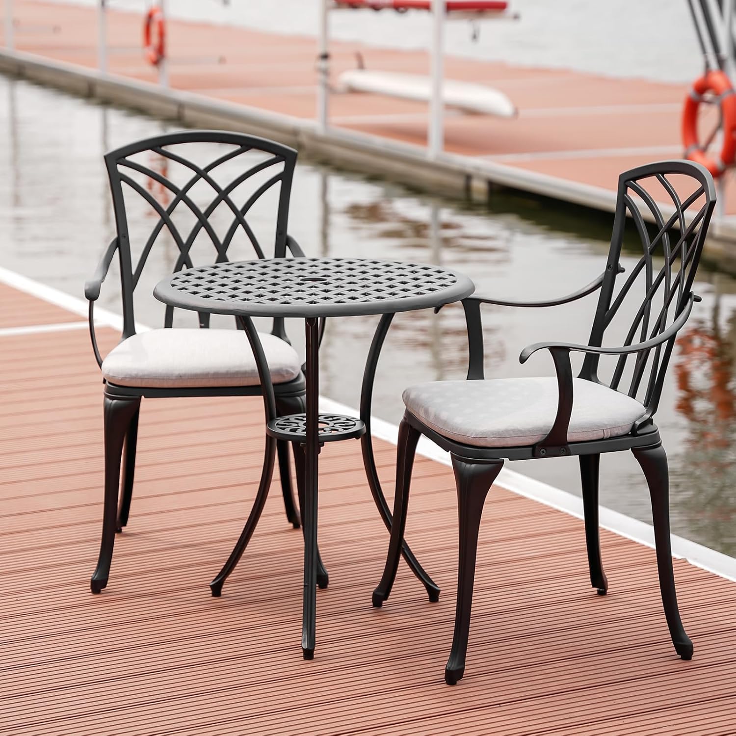 3 Piece Outdoor Bistro Table Set with Cushions, Cast Aluminum Patio Bistro Sets Patio Set with Umbrella Hole, All Weather Patio Table and Chairs Set of 2 for Garden, Black