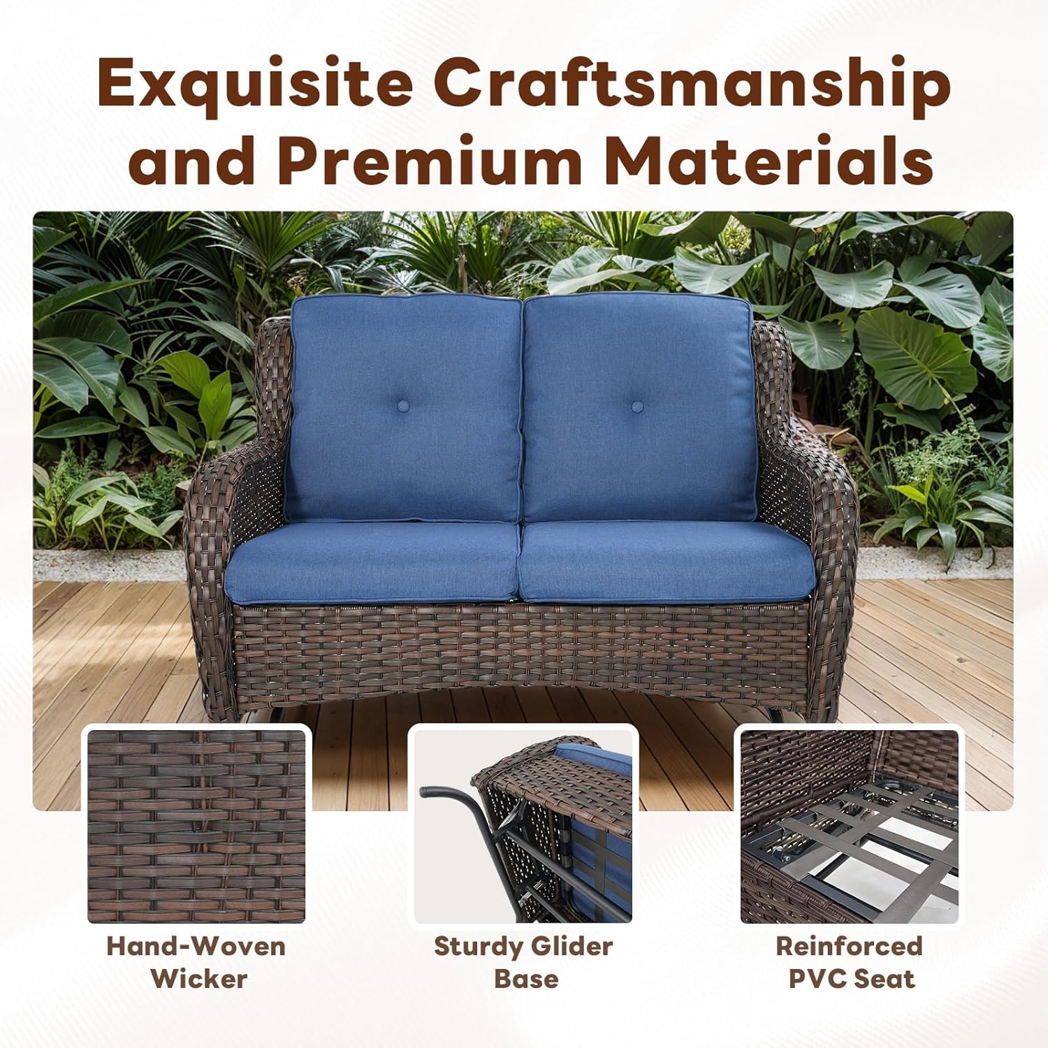 - Elegant Outdoor Loveseat Glider Chair: Elevate your outdoor living with this stylish outdoor loveseat glider chair. Perfect for relaxing on your patio, garden, or porch, it combines elegance and functionality to create a cozy spot for two people to enjoy together.