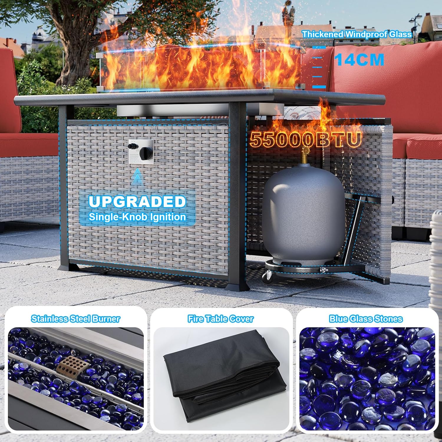 11-Piece Patio Furniture Set, Outdoor Patio Furniture with 55,000 BTU Fire Pit Table, Swivel Chairs Set, Thick Cushions, Modular Patio Sofa, Dual-Strand Wicker Rattan, Rust-Resistant Frame, Red