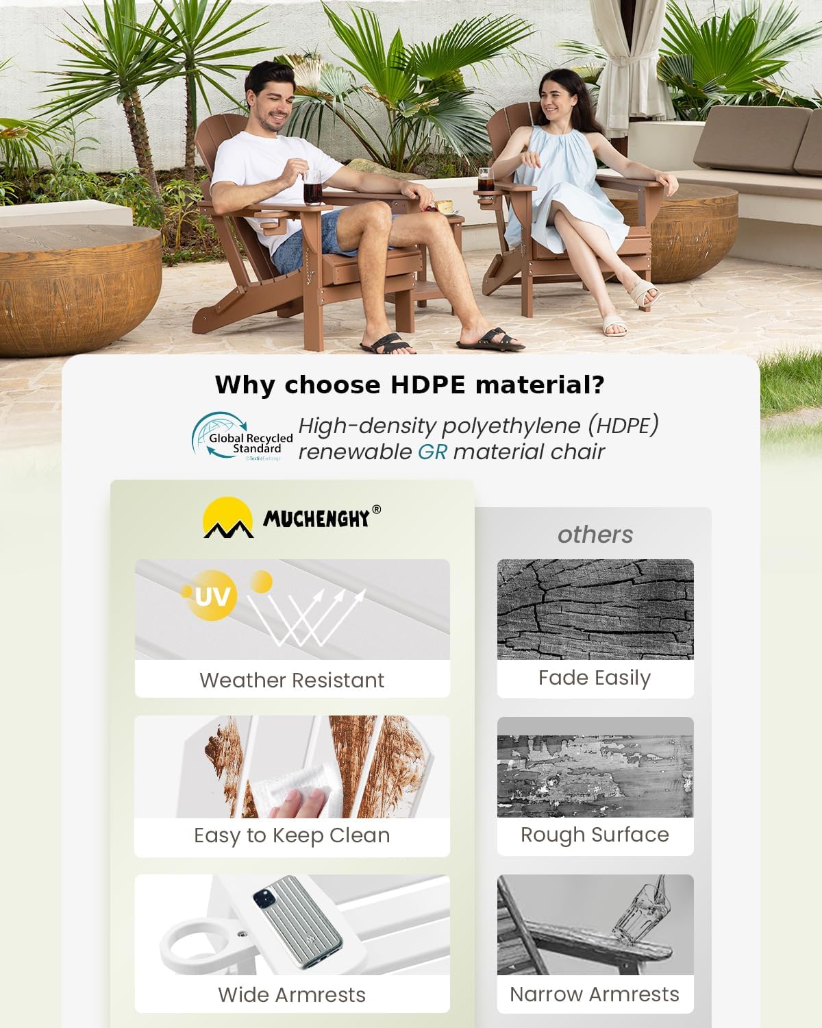 - MUCHENGHY Adirondack Chair: Our patio chair can be folded in a portable size easily by pulling out the chain on the right chair leg, the foldable design also makes it easy to transport and store