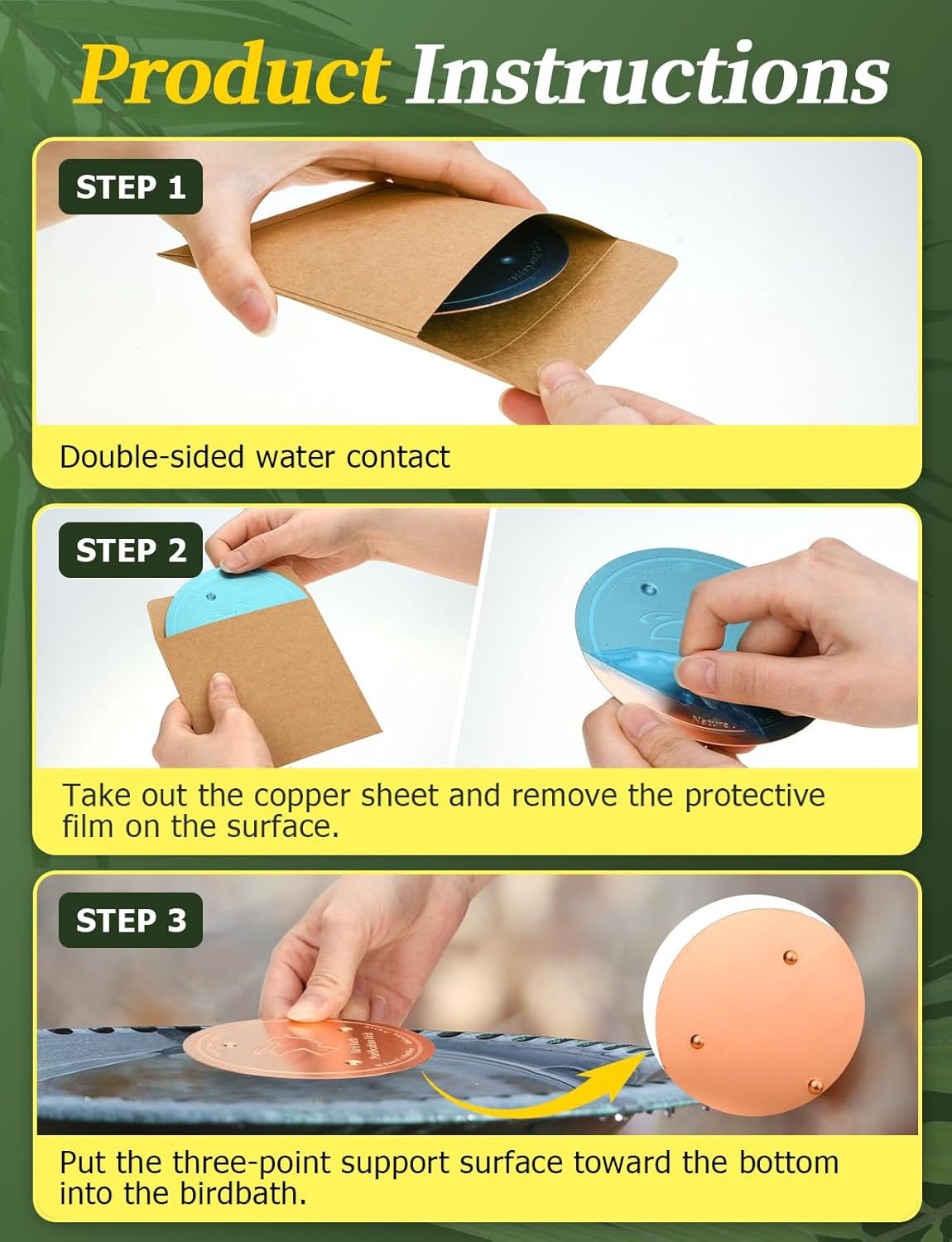 - Effective Design for Maximum Contact: The bird bath copper disk features a three-point support design, maximizing surface contact with the water, keeping your bird bath clean and fresh. Say goodbye to the frequent and tedious cleaning of slimy, green bird baths. With the copper disk, cleaning intervals can extend from approximately every 3 days to about every 14 days, saving you around 120 minutes of cleaning time each month.