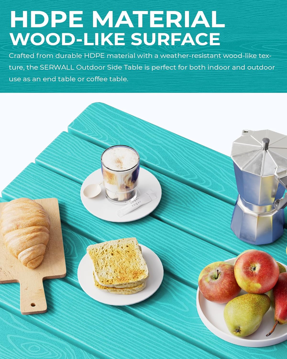 - [Premium Wood-Textured Surface] Offering the aesthetic appeal of wood without the upkeep, the SERWALL Side Table features a wood-textured HDPE surface that adds an elegant and natural touch to your outdoor decor.