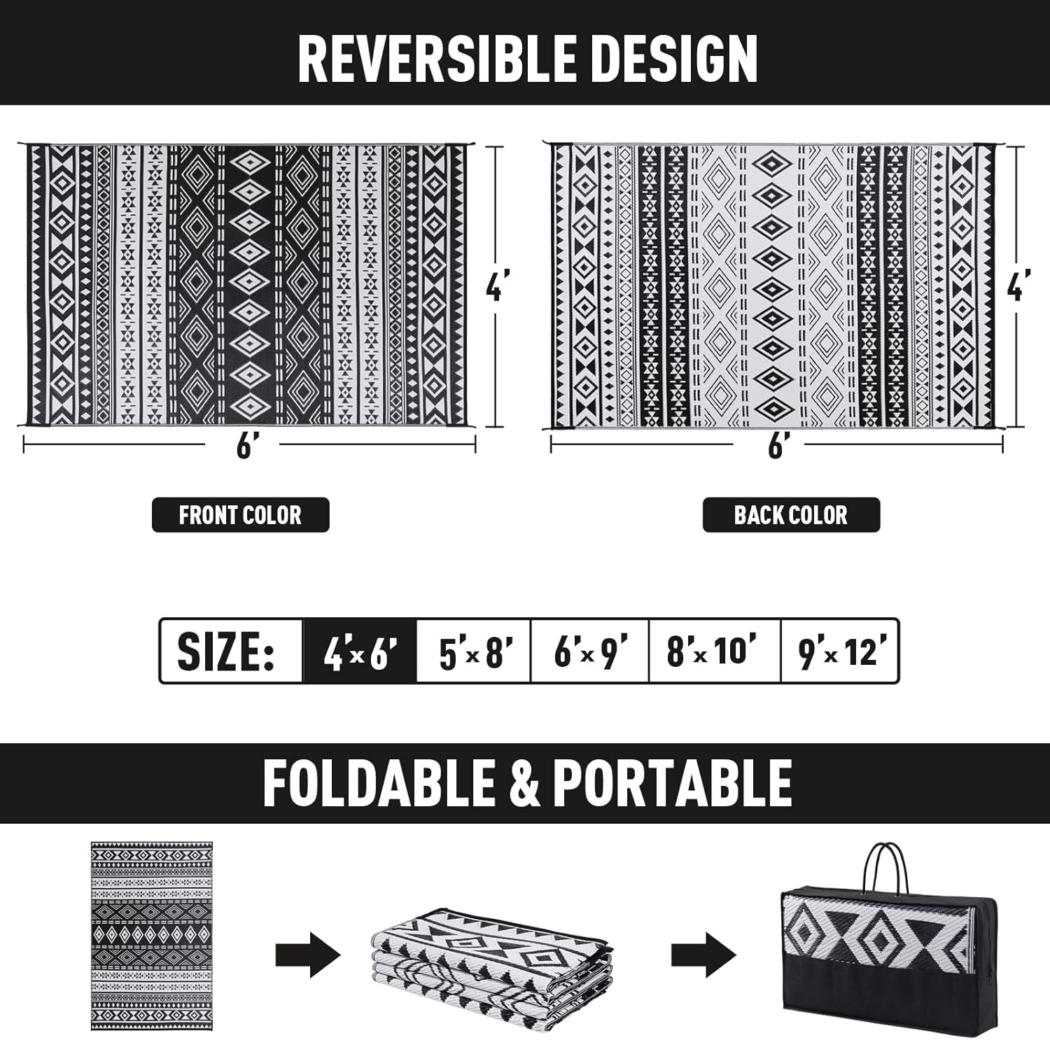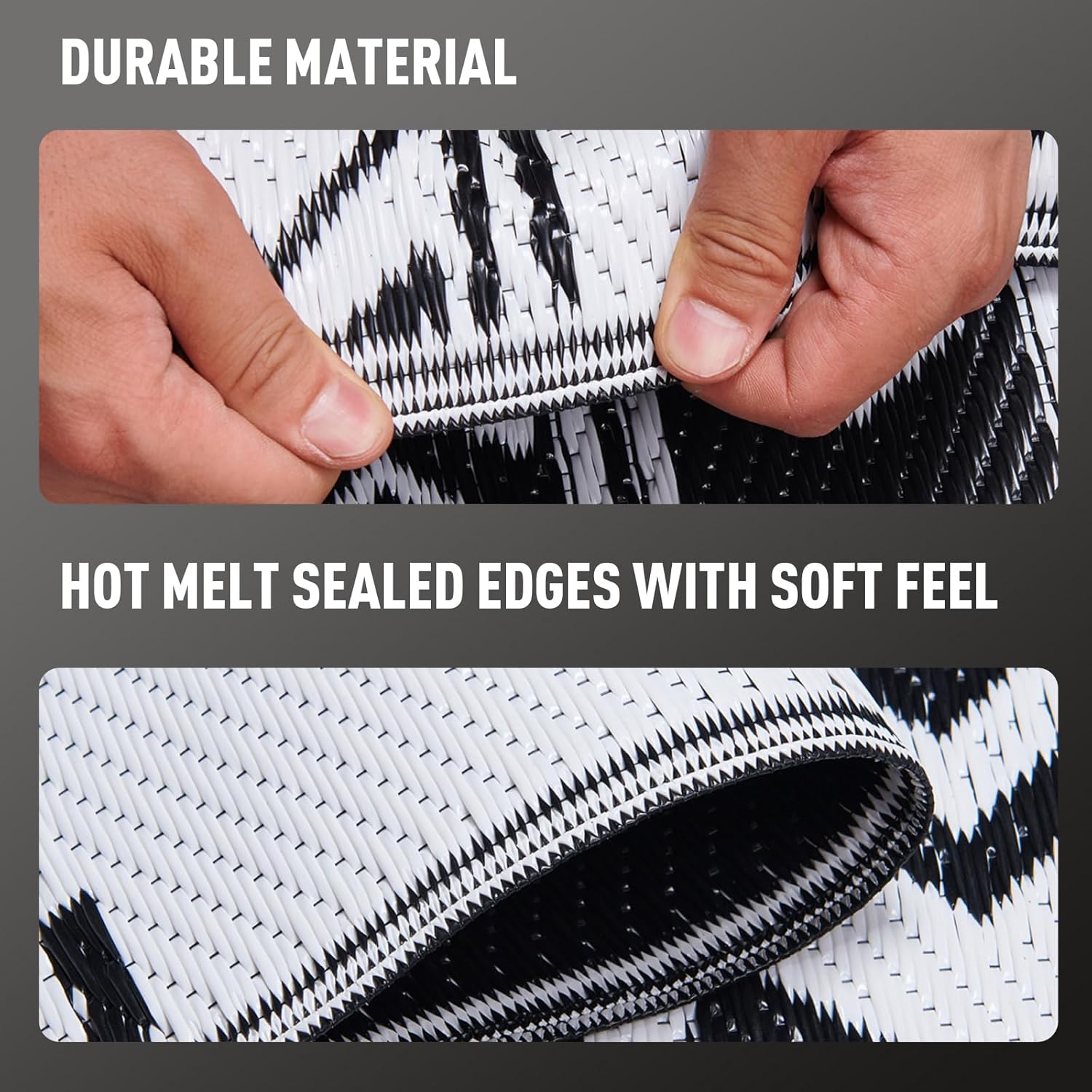- Portable & Durable: This outdoor plastic rug with seams can be rolled or folded into a compact size and comes with a carrying bag for easy portability. Perfect for outdoor activities, picnics, sunbathing, and RV road trips. The heat-sealed edges prevent wear and tear, withstanding any environment, traffic, or scratches