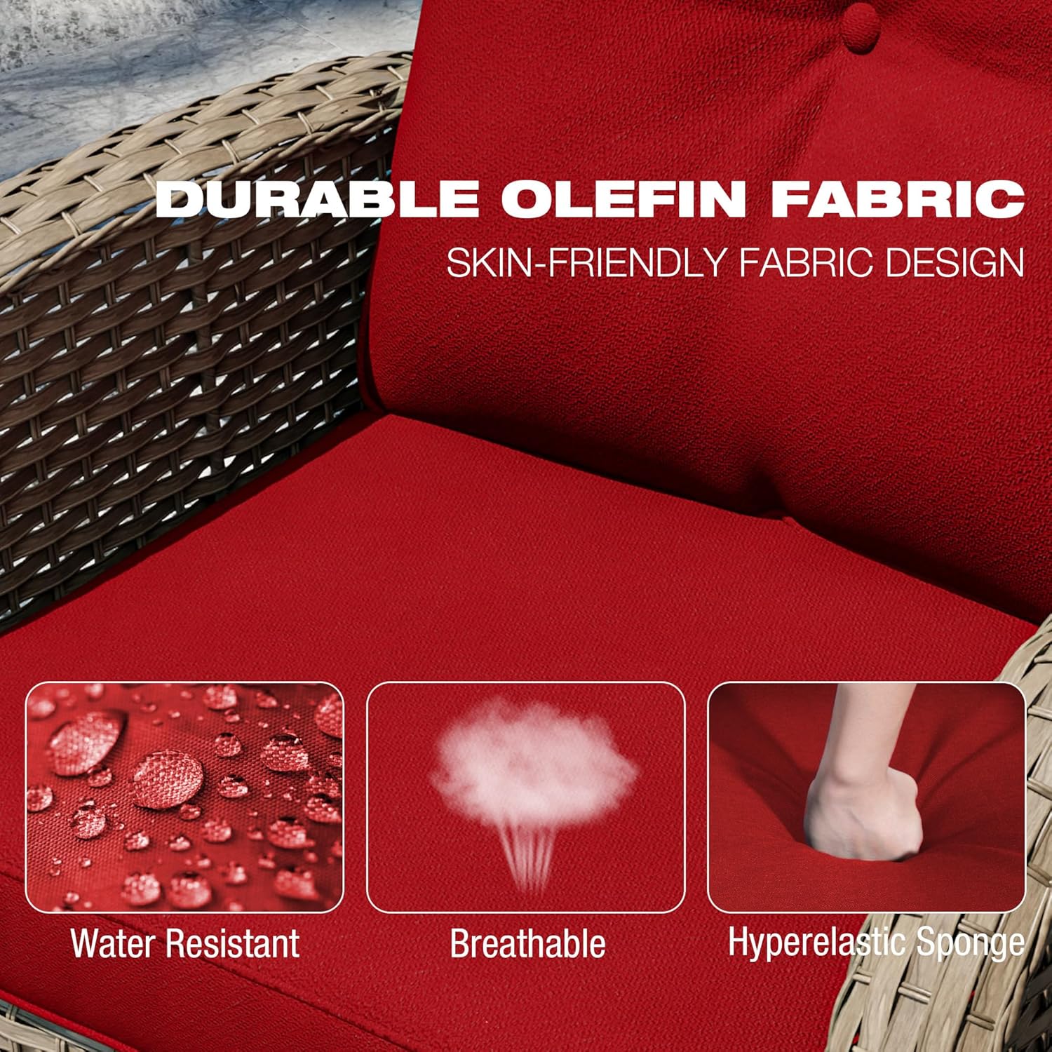 Joyside Outdoor Swivel Rocker Chairs, 6 Piece Wicker Patio Set with Thick Cushion and Side Table, Rattan Patio Swivel Rocking Chairs for Porch, Deck Use (Natural/Red, 6 PCS)