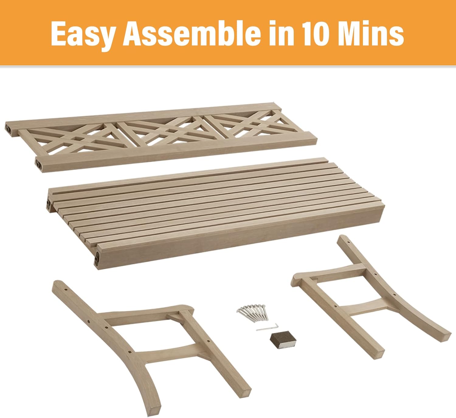 - Quick and Easy Assembly Designed for convenience, this 2-person bench comes with 4 pre-assembled pieces and 8 identical screws. Follow the included manual, and you’ll have your eco-friendly outdoor bench ready in just 10 minutes. All necessary installation tools are included for a stress-free setup.