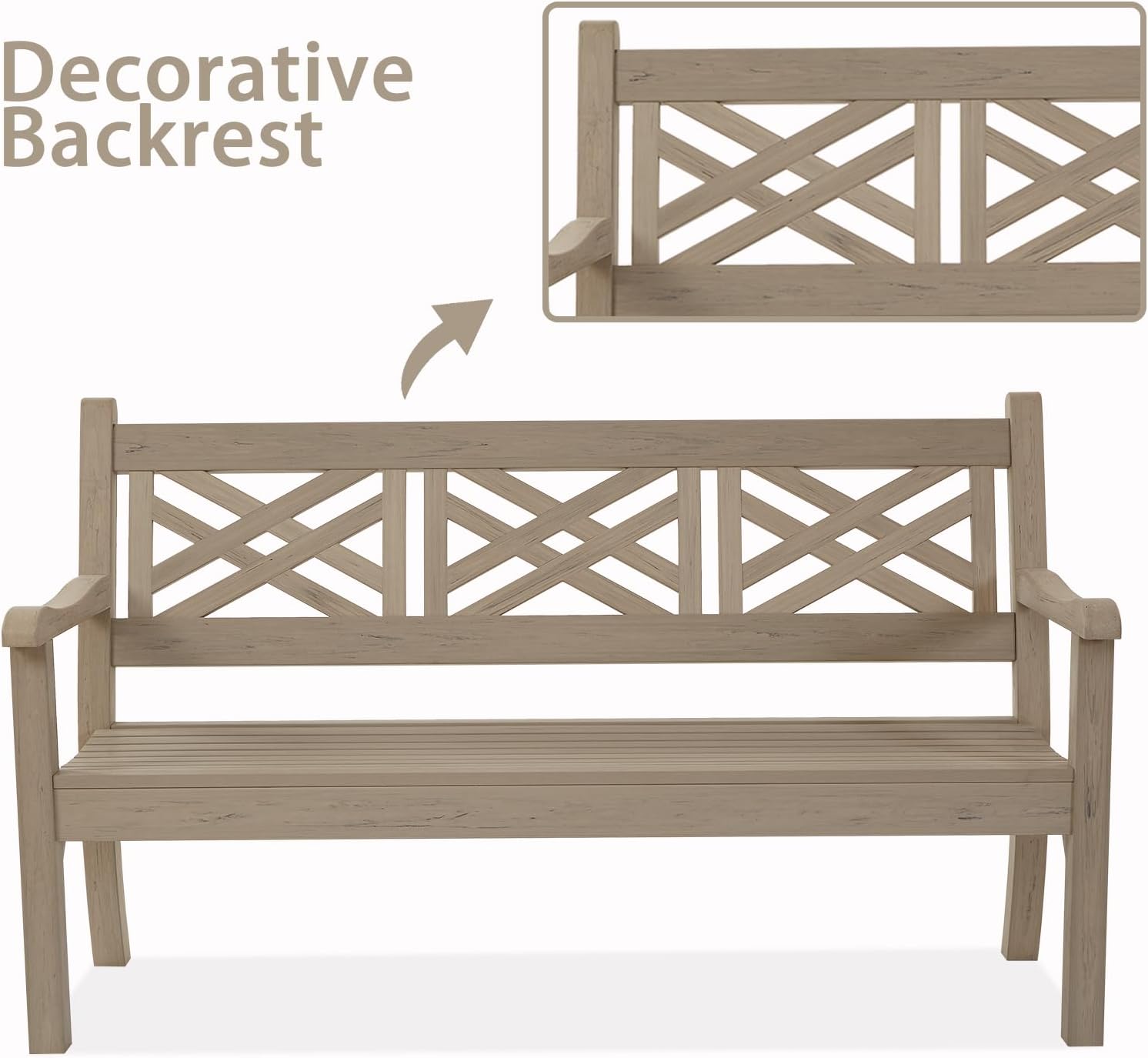 Psilvam 63''W All-Weather Poly Lumber Outdoor Bench – Teak Color, 3-Person Garden Bench with Decorative Backrest & Curved Armrests, Anti-Rot & Fade-Free Patio Bench for Porch, Backyard, and Park(Grey)