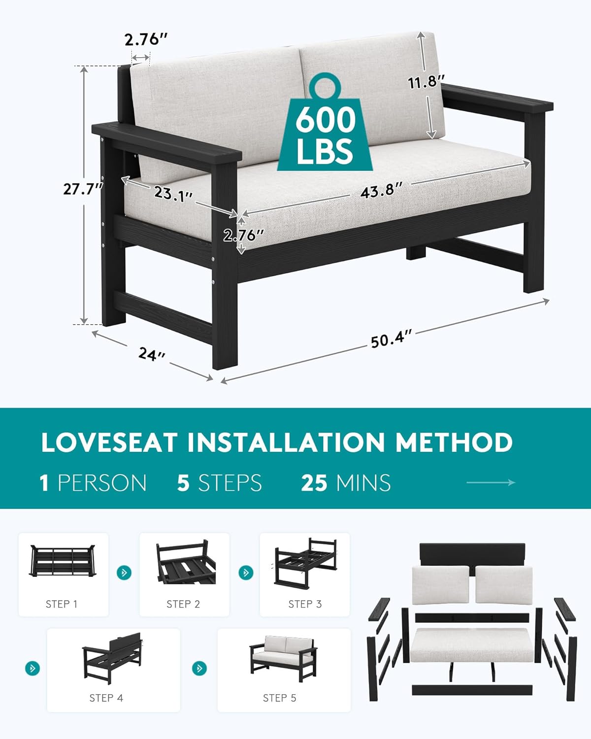 - One-Size-Fits-All: SERWALL 2-seater outdoor sofa measured 51.9''L x 24.0''W x 24.8''H, single-seater sofas measured 28.3''L x 24.0''W x 24.8''H. Each seat can hold up to 350LBS. The universal size ensures comfort, allowing you to enjoy tranquil moments in your garden or patio.