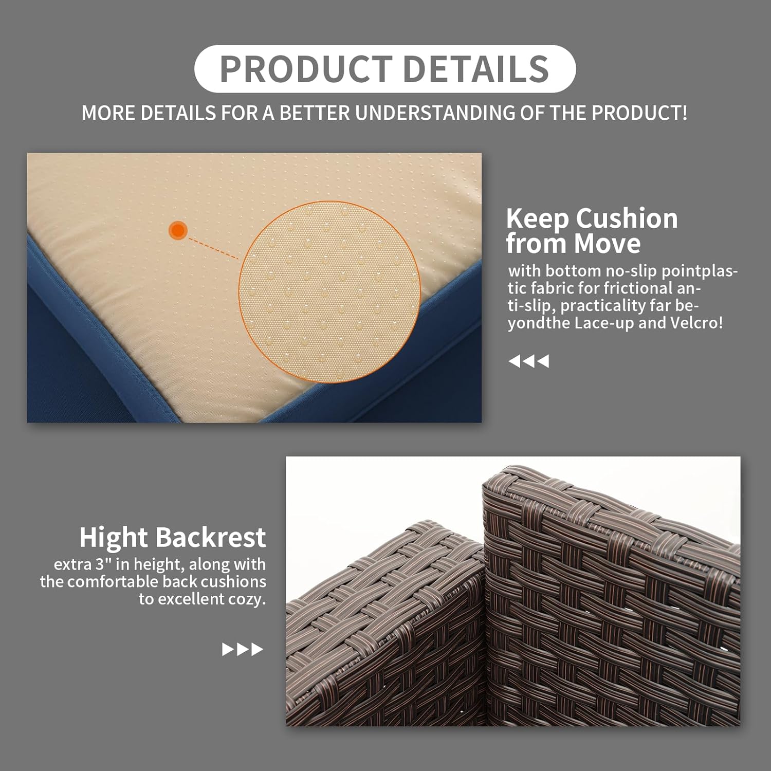 - Comfortable & Non-slip: Thickened seat cushions(4") with high resilience sponge and bottom anti-slip dotted plastic fabric, anti-slip and practicality are wholly better than lacing, velcro or hook, match up filling back cushions, which is extraordinarily comfortable and everlasting. Plus, lumbar pillows are free and style randomly.