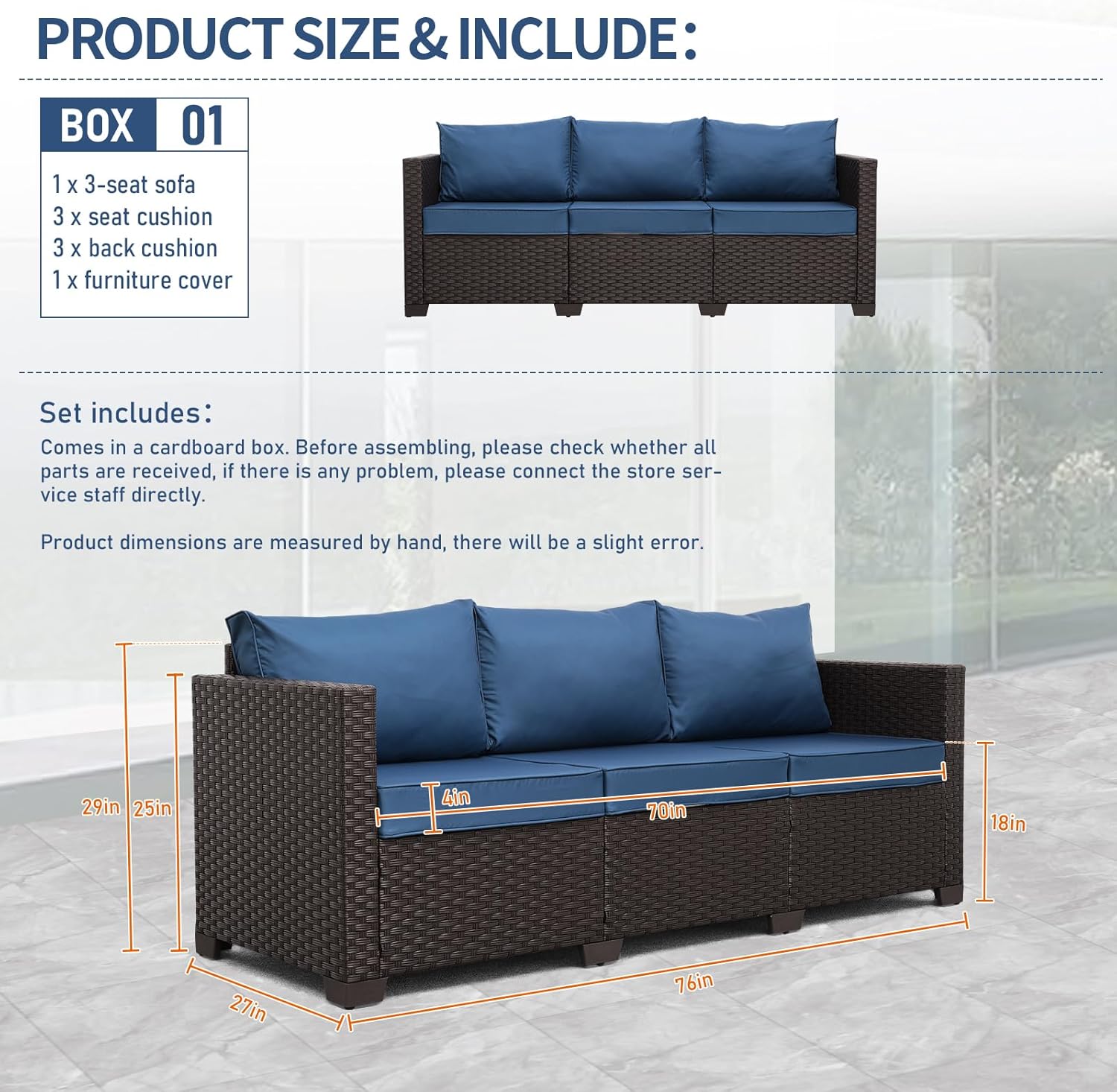 Outdoor Couch Wicker Patio Furniture 3-seat Sofa Outdoor Furniture Deep Seat Hight Backrest Waterproof Cover Non-Slip Cushions, Navy Blue