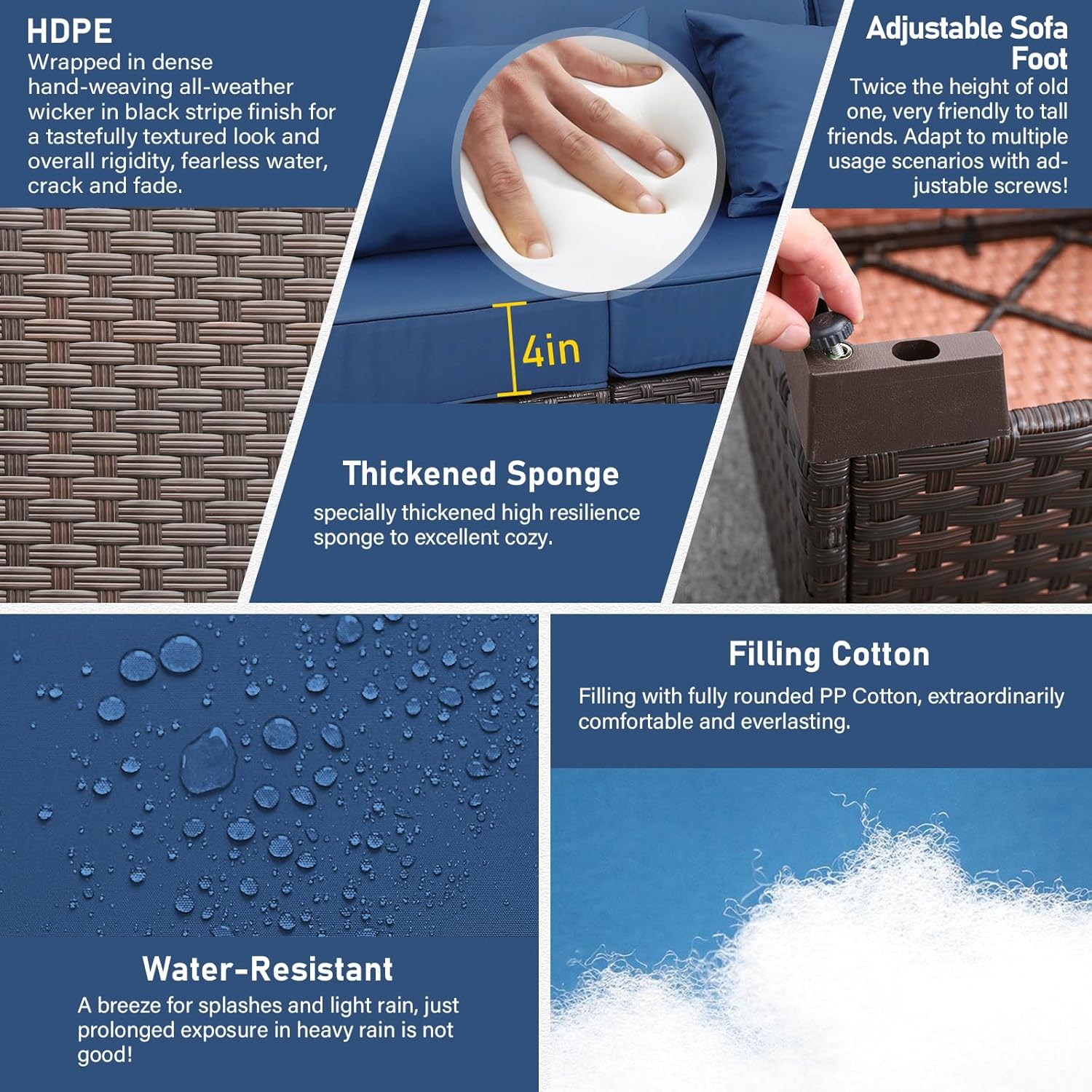 - Quality & Maintain: Delicate composite weaving with half-moon and round all-weather HDPE wicker material handwoven over fully-welded powder-coated steel framing makes outdoor patio furniture very durable and sturdy. Breathable 250G polyester Anti-UV and water-repellent fabric. Each piece is designed to withstand sunshine beating down and rainstorms rolling through.