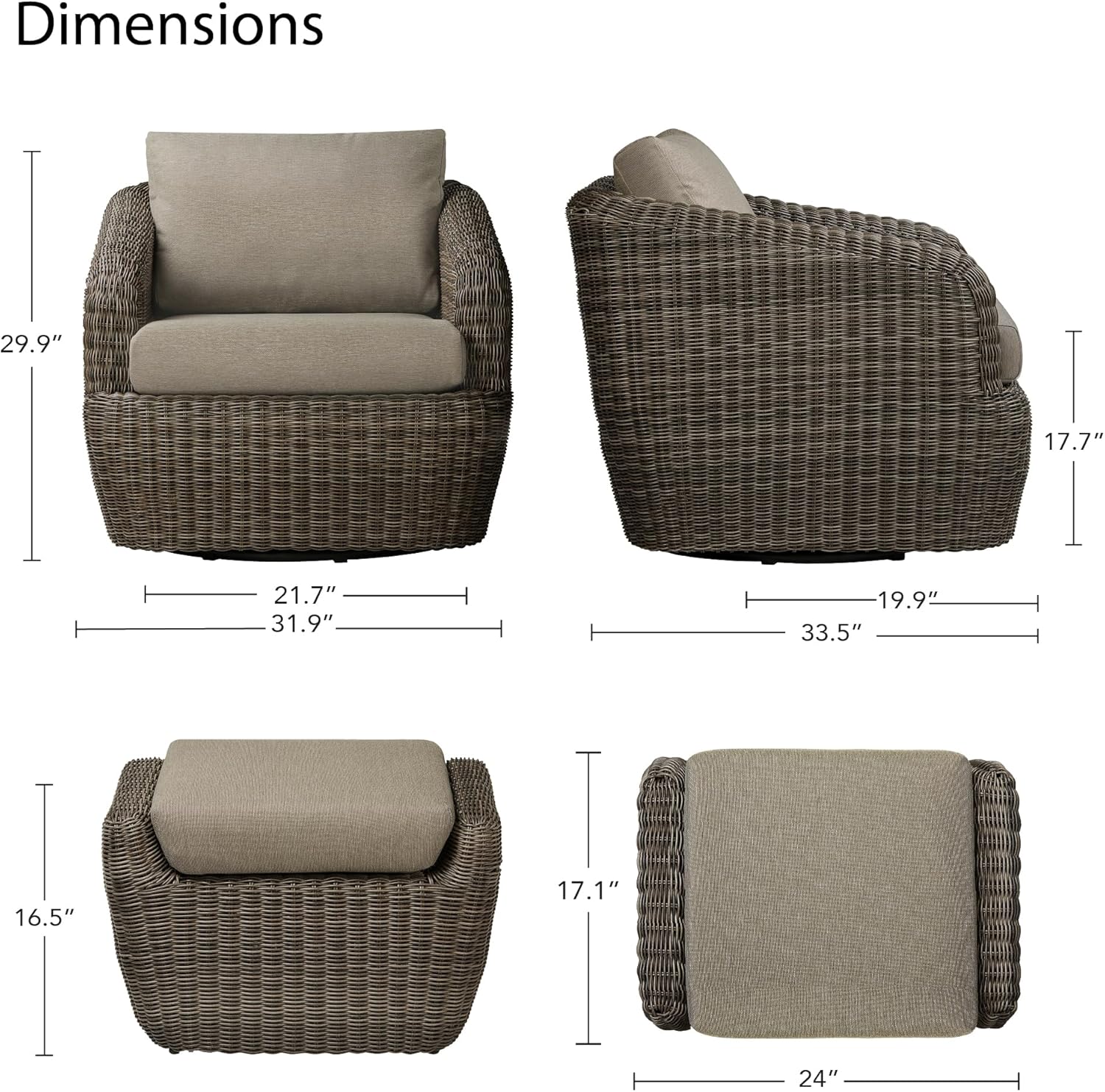- Fully Assembled & Convenient - This swivel chair and ottoman arrives fully assembled, ready to be placed in your outdoor space hassle-free. Note: The product’s color may vary under different lighting conditions. For accurate color representation, always refer to the actual product.