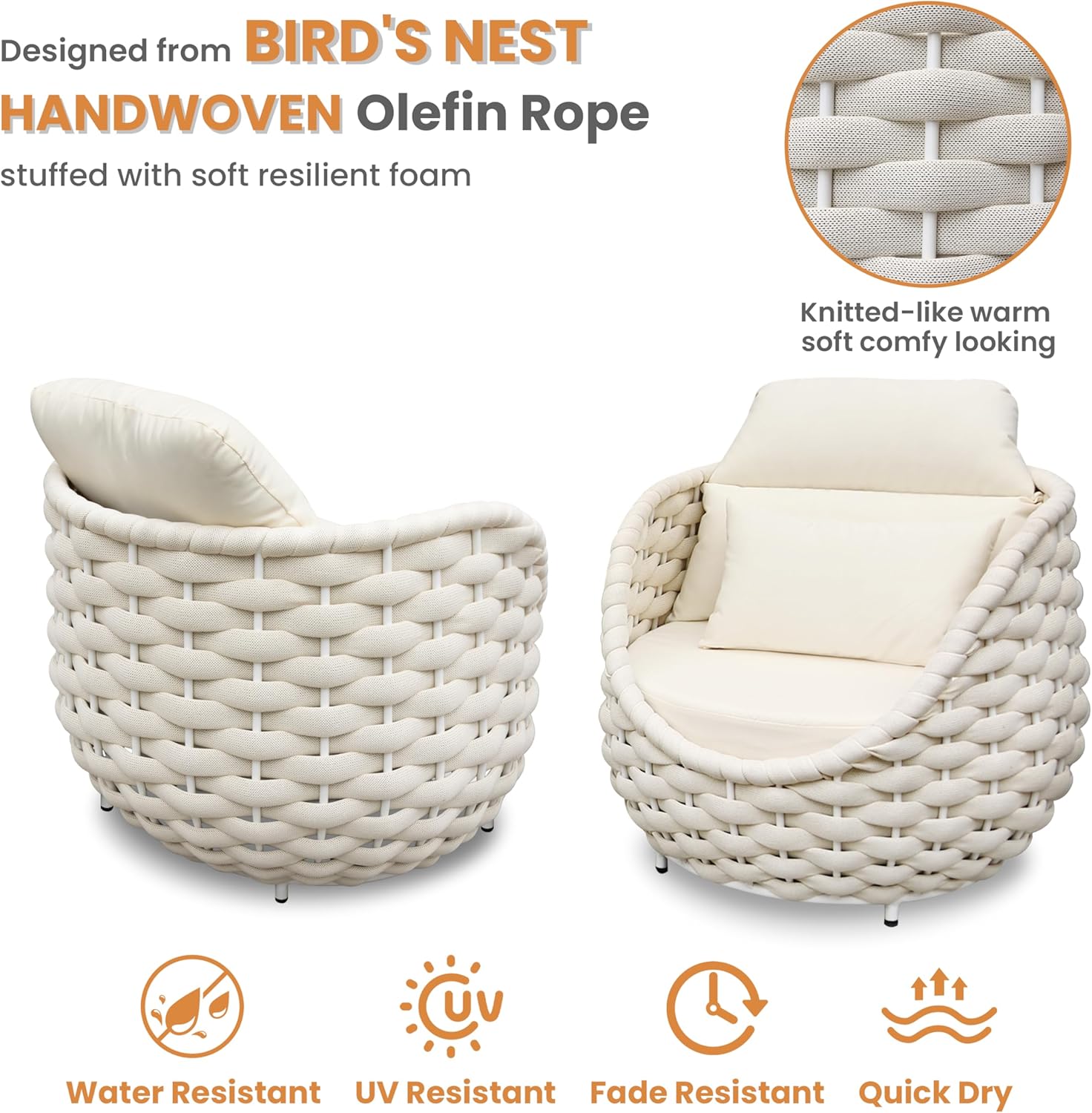 - Inspired by bird's nest shape, the Erotr assembled cushioned chair set for 1 person combines comfort, elegance and durability. Knitted-like rope fabric gives warm comfy looking. Curved scoop armrest, supportive backrest and deep cushioning offer an enveloping ultimate relaxation