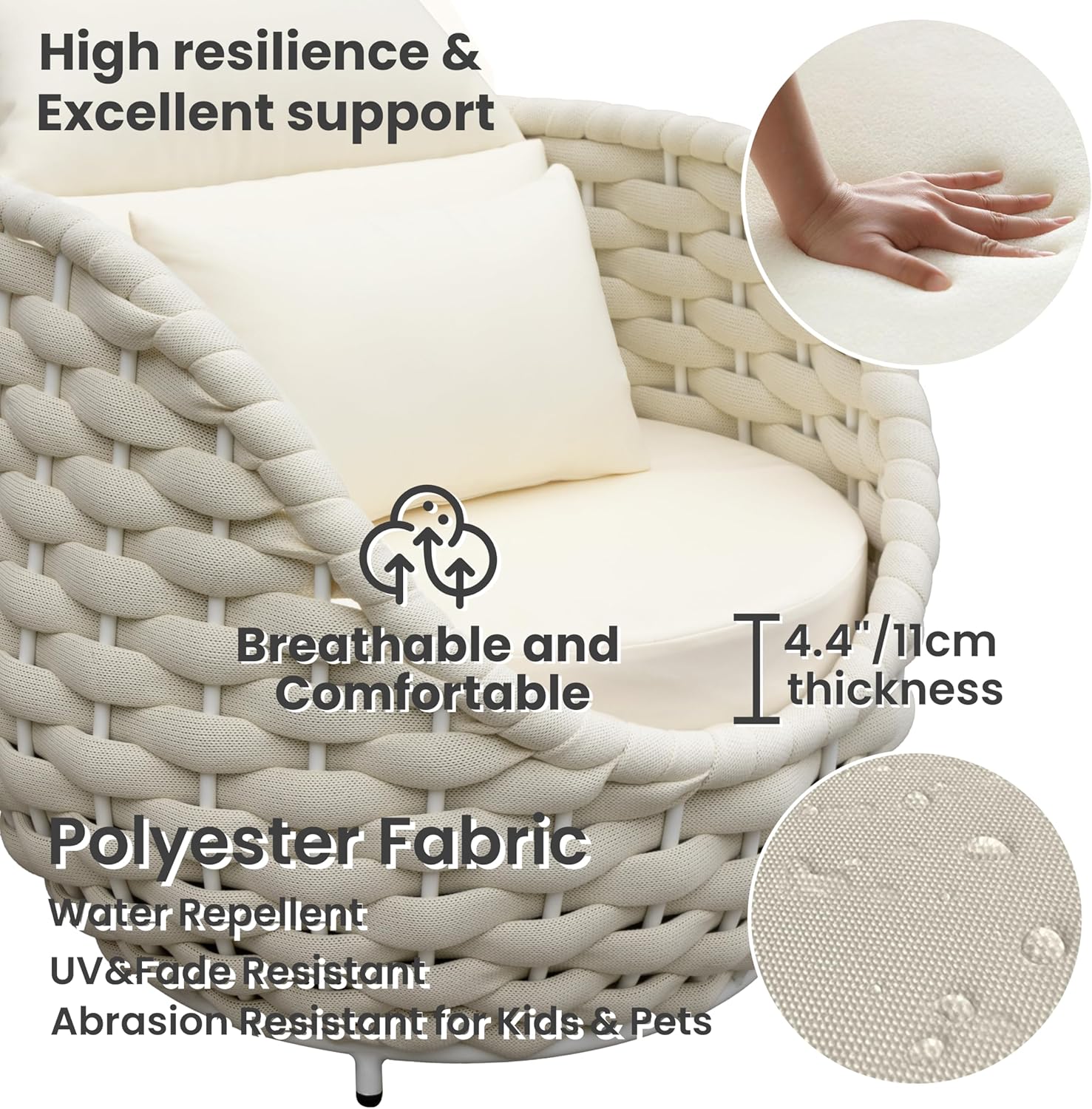- Filled with 4.3"/11cm thick high-density sponge and cotton, cushions are comfy touching and breathable for a refresh patio seating holding its shape in long time using. Water repellent and abrasion resistant polyester fabric also fits families with kids and pets
