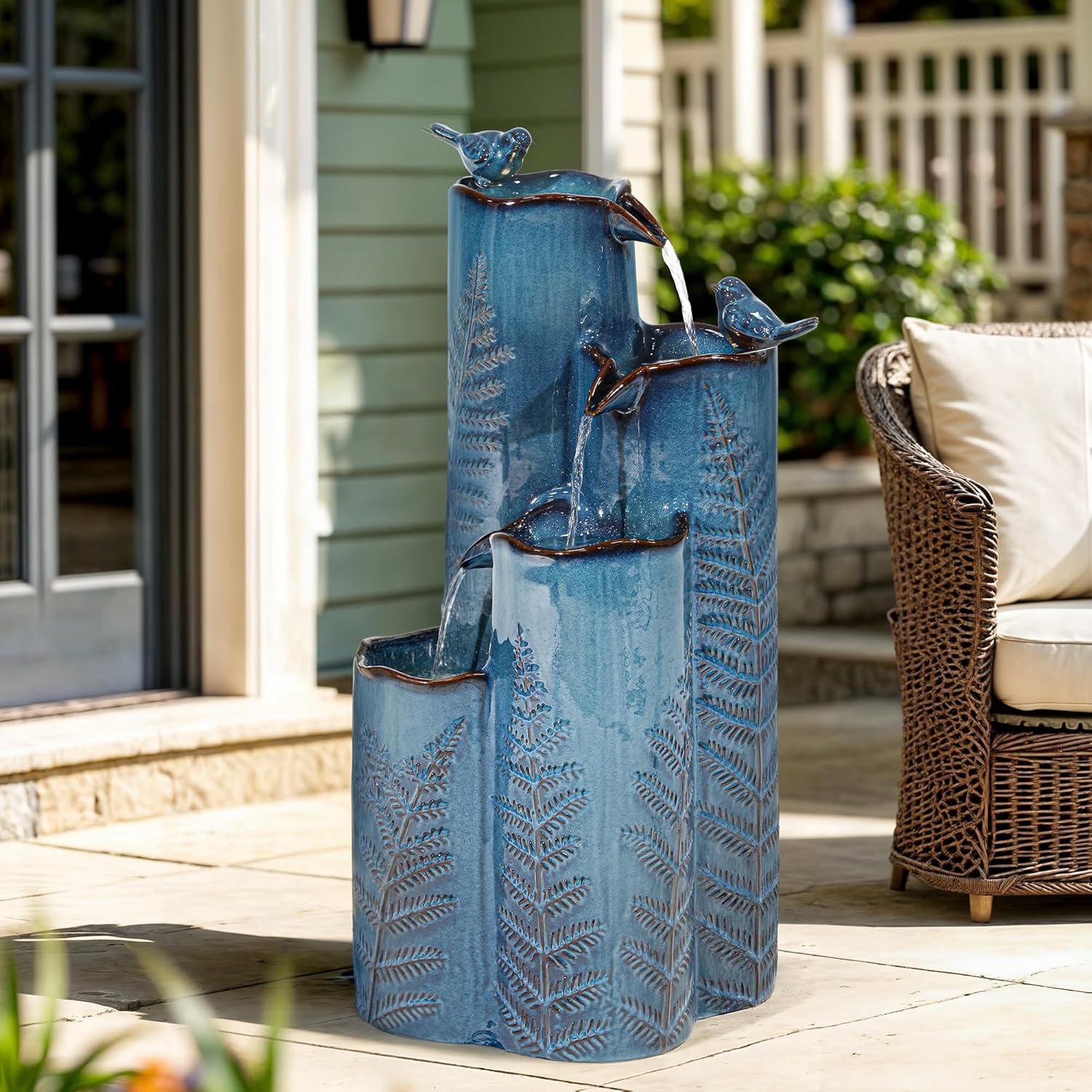 - ELEGANT CERAMIC OUTDOOR FOUNTAIN: This 4-tier ceramic vase water fountain features charming handcrafted kiln-fired reactive glaze and embossed fern patterns. Standing at 12.8"L X 12.4"W X 32.28"H, it is sure a stunning focal point in your garden, patio, or backyard, adding natural beauty with artistic elegance.