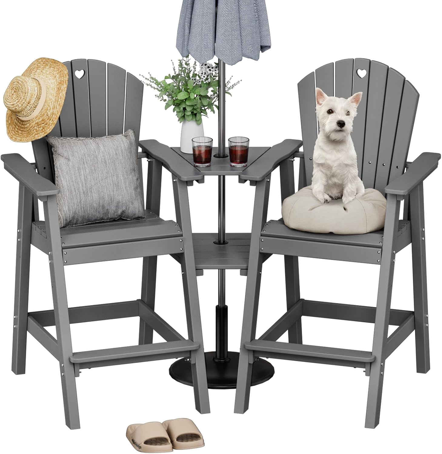 Tall Adirondack Chairs Set of 2-Durable HDPE Outdoor Bar Stools with Double Connecting Tray, Weatherproof Patio Furniture for Poolside, Backyard, Deck & Lawn Relaxation (Gery)