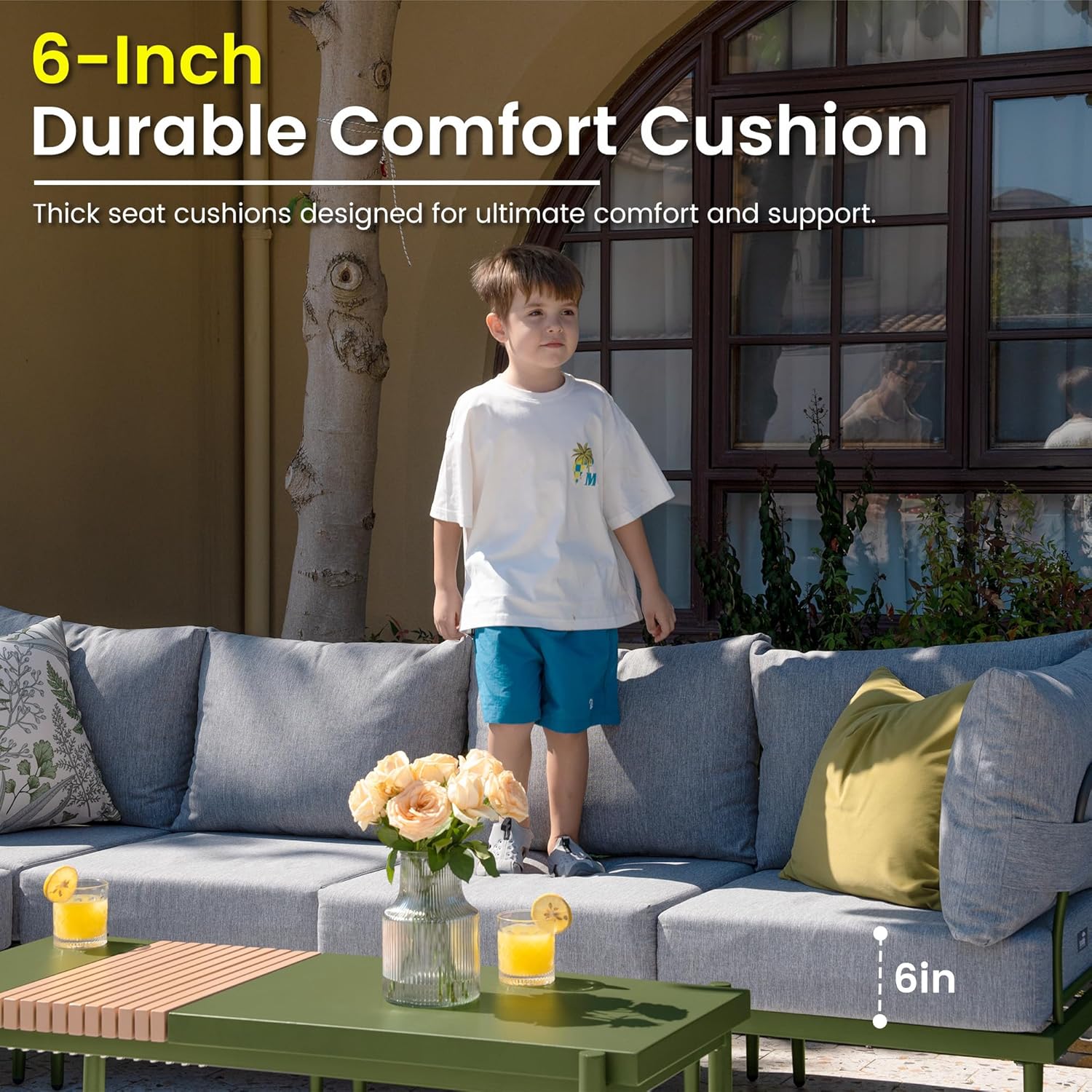 - Comfy 6 Inch Cushion: The patio furniture set's cushion is a generous 6 inches thick, providing superior support for a relaxing lounging experience. The thick padding ensures long-lasting comfort whether you're seated for hours or just soaking up the sun
