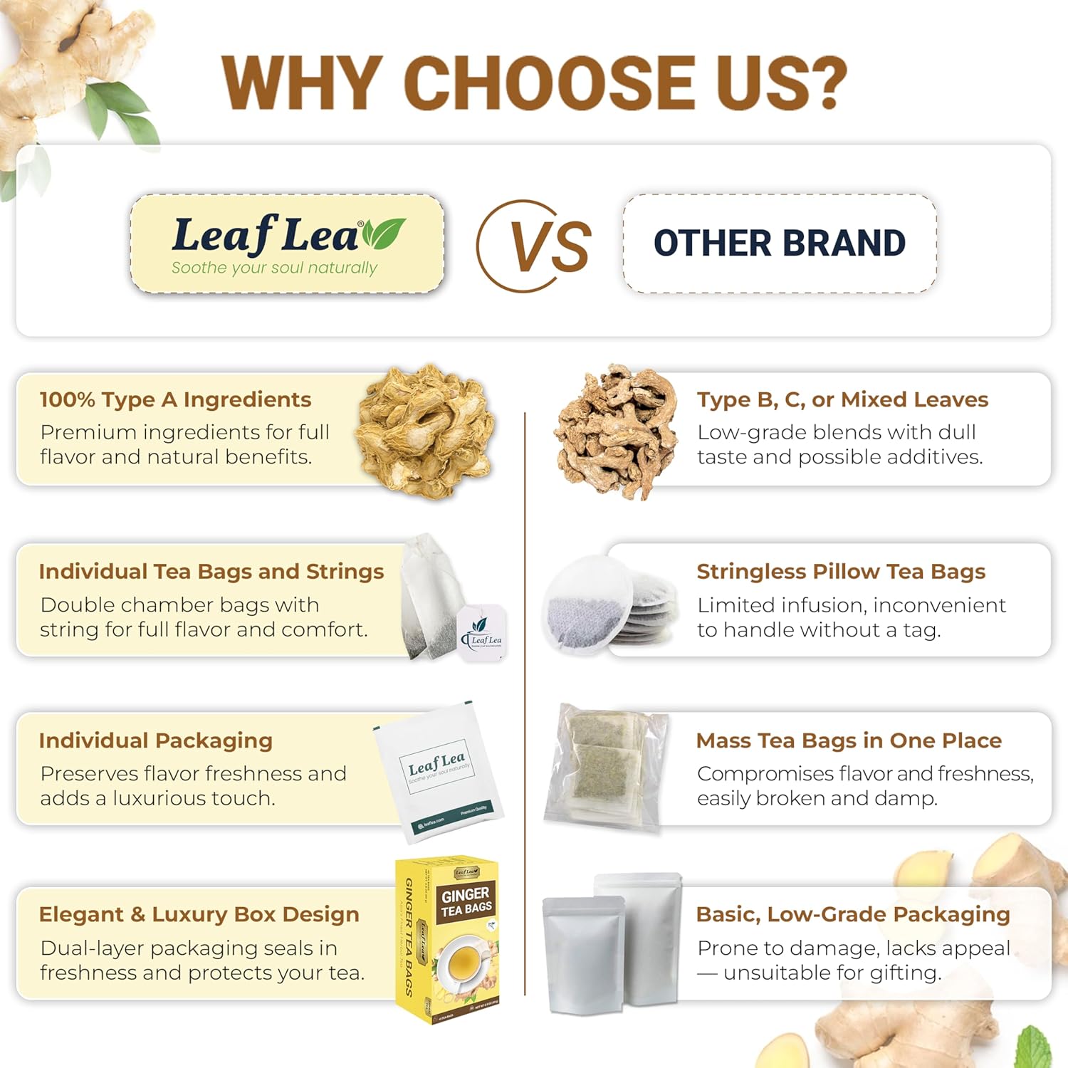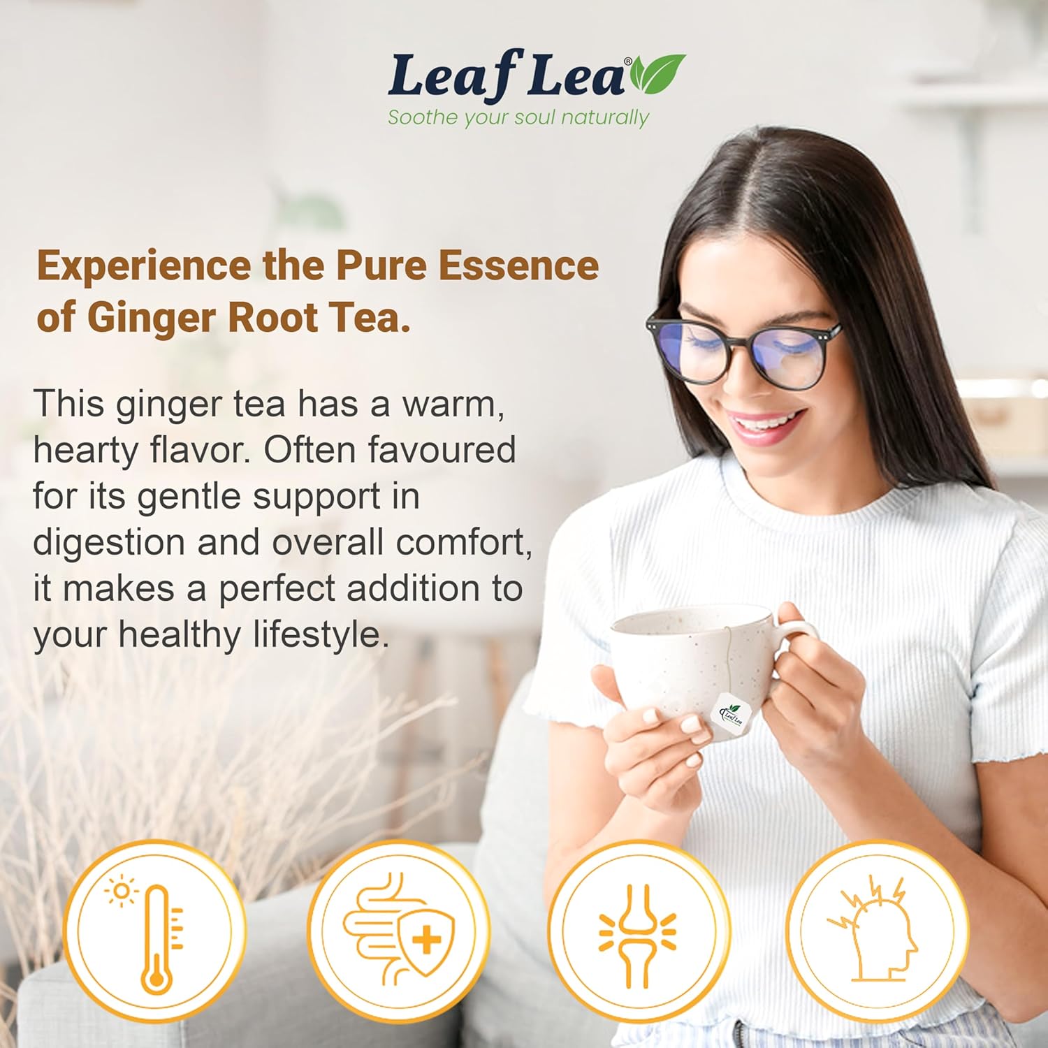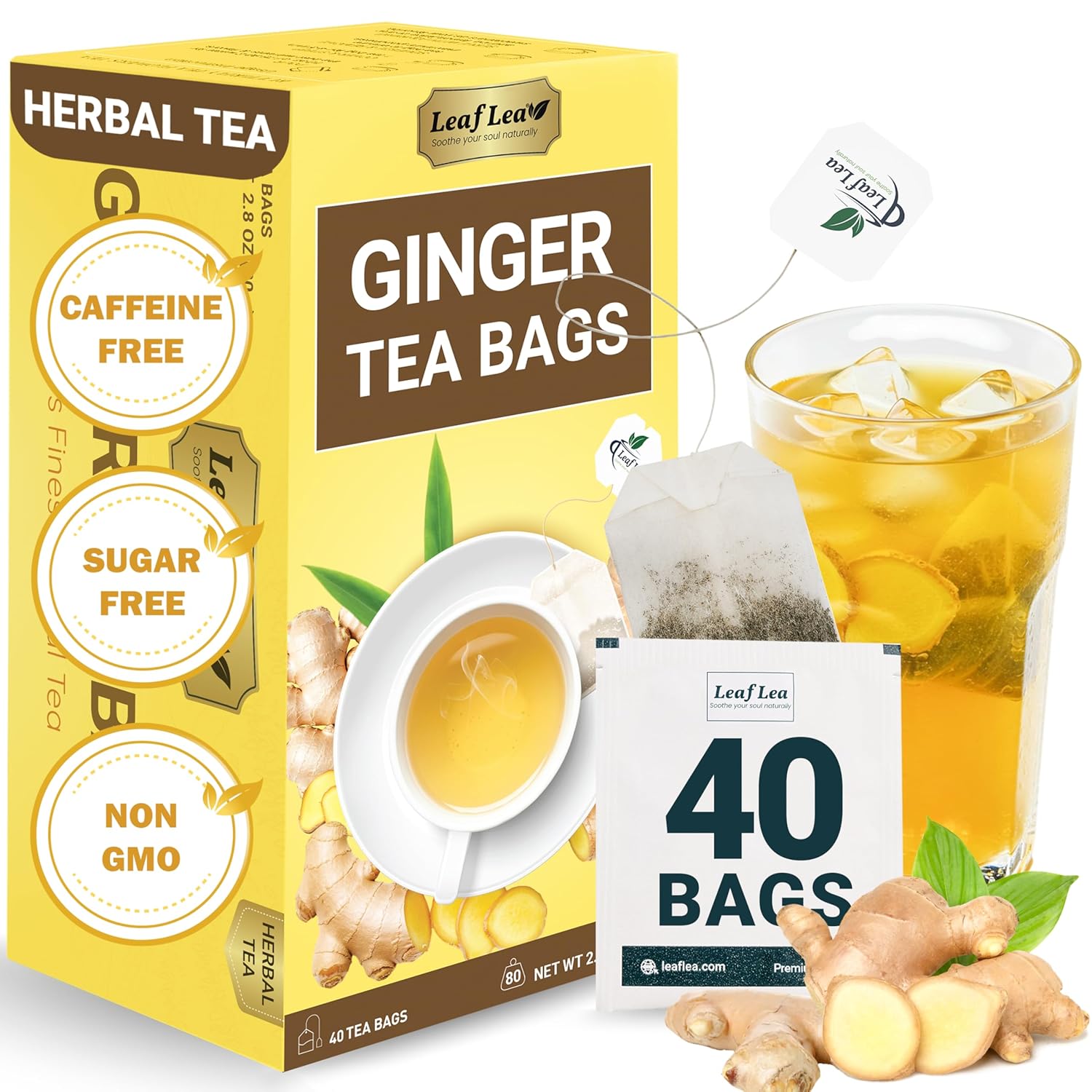 LeafLea 40 Ginger Tea Bags, 100% Pure & Natural from Dried Ginger Root Tea, Spicy & Comforting Herbal Tea Supports Digestion, Caffeine Free, Sugar Free, No Gluten, Non-GMO, Vegan