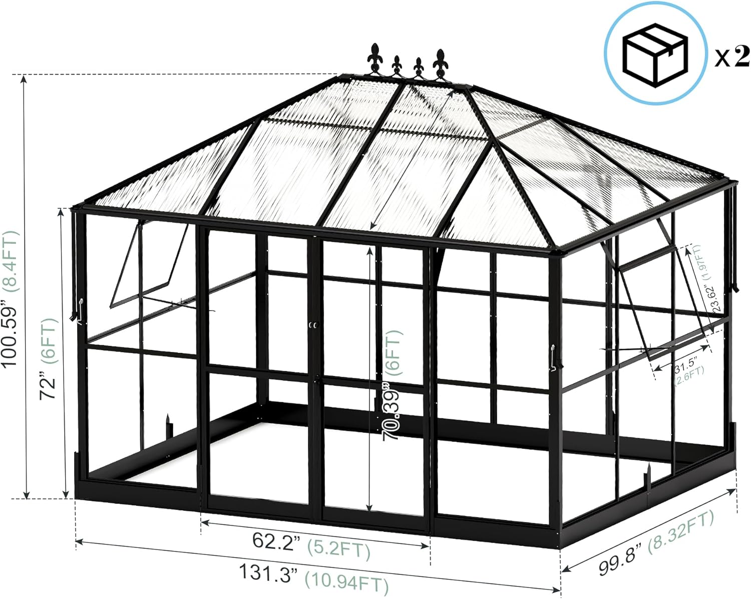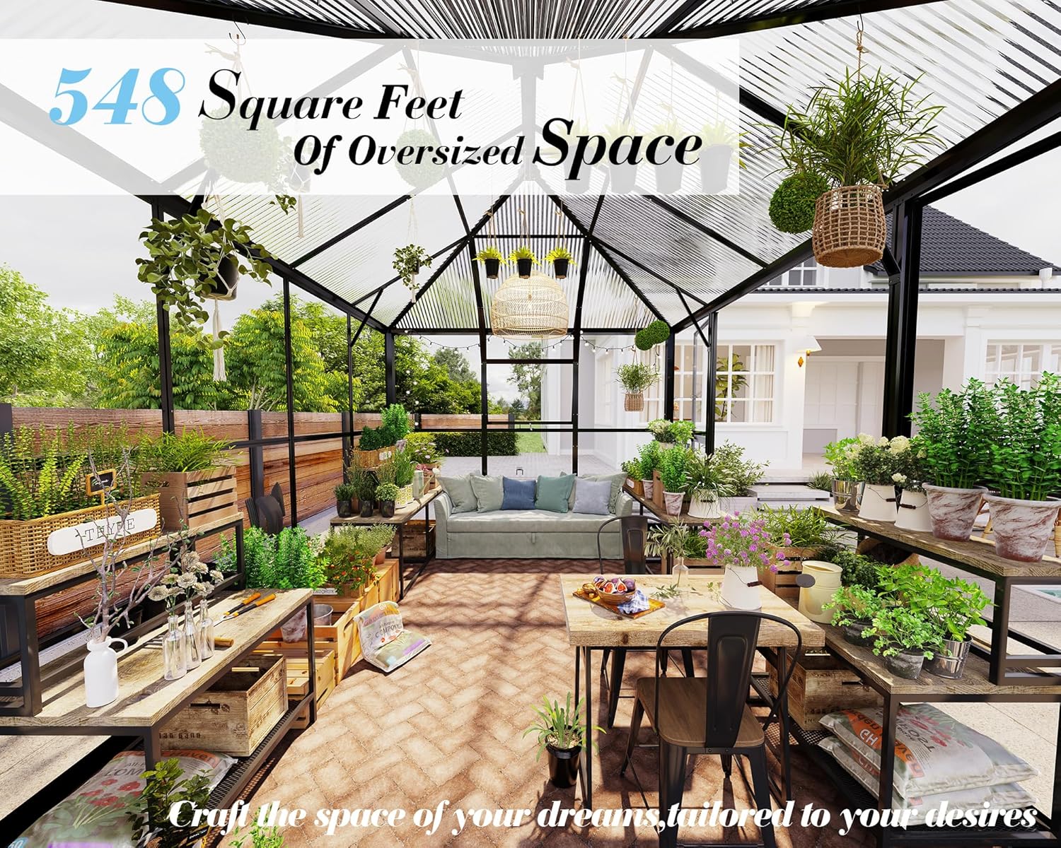 - 【Versatile Space】600 cu. Ft. to create a perfect warm environment for your personal plants. Transform your polycarbonate greenhouse into a functional living space by adding furniture. Exclusive design patent & a spear-like top discourages bird perching. Recommended to build a 12x9.3 FT foundation for it
