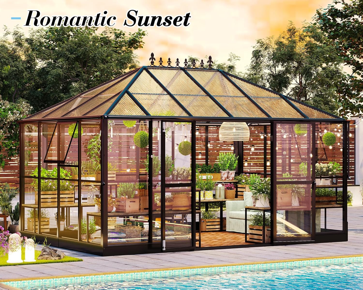 - 【Versatile Space】850 cu. Ft. to create a perfect warm environment for your personal plants. Transform your polycarbonate greenhouse into a functional living space by adding furniture. Exclusive design patent & a spear-like top discourages bird perching. Recommended to build a 15x10.5 FT foundation for it
