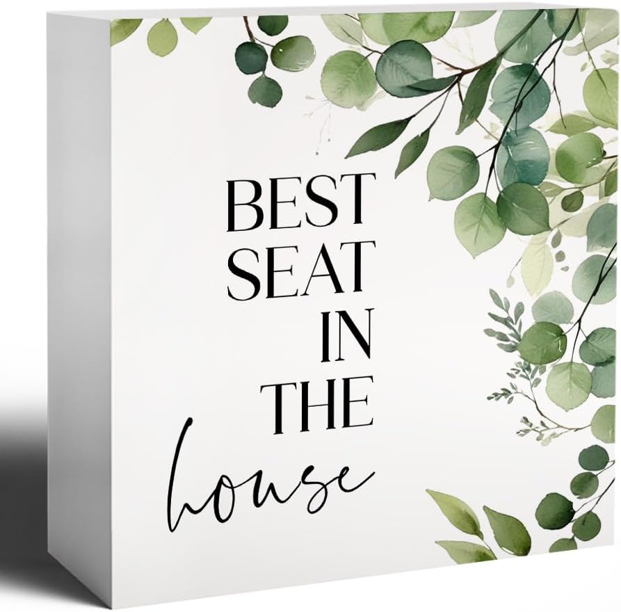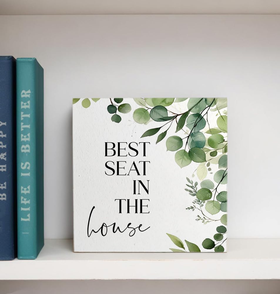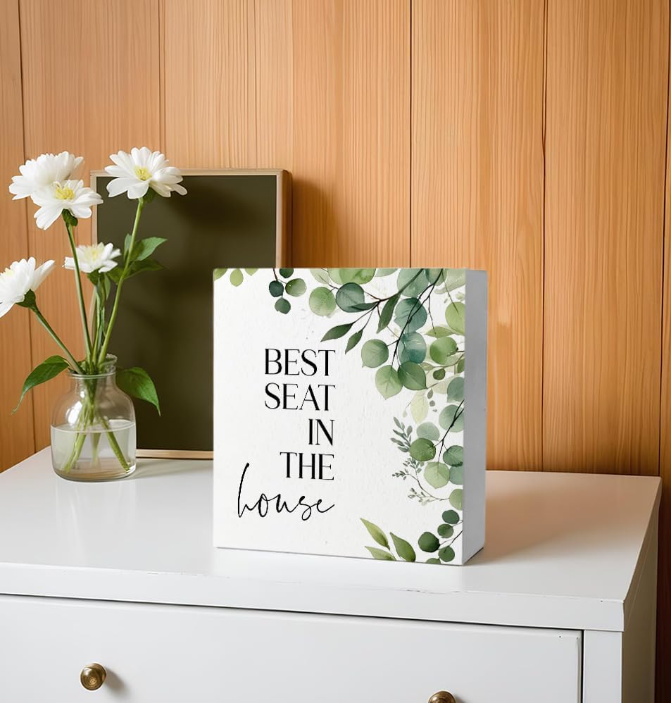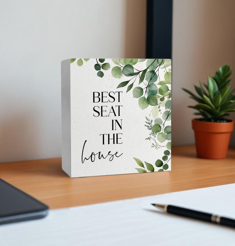 Funny Bathroom Signs, Best Seat in the House Wooden Box Sign, Eucalyptus Botanical Wood Signs Plaque for Restroom Washroom Toilet Counter Shelf Table Decor, 5x5 Inch