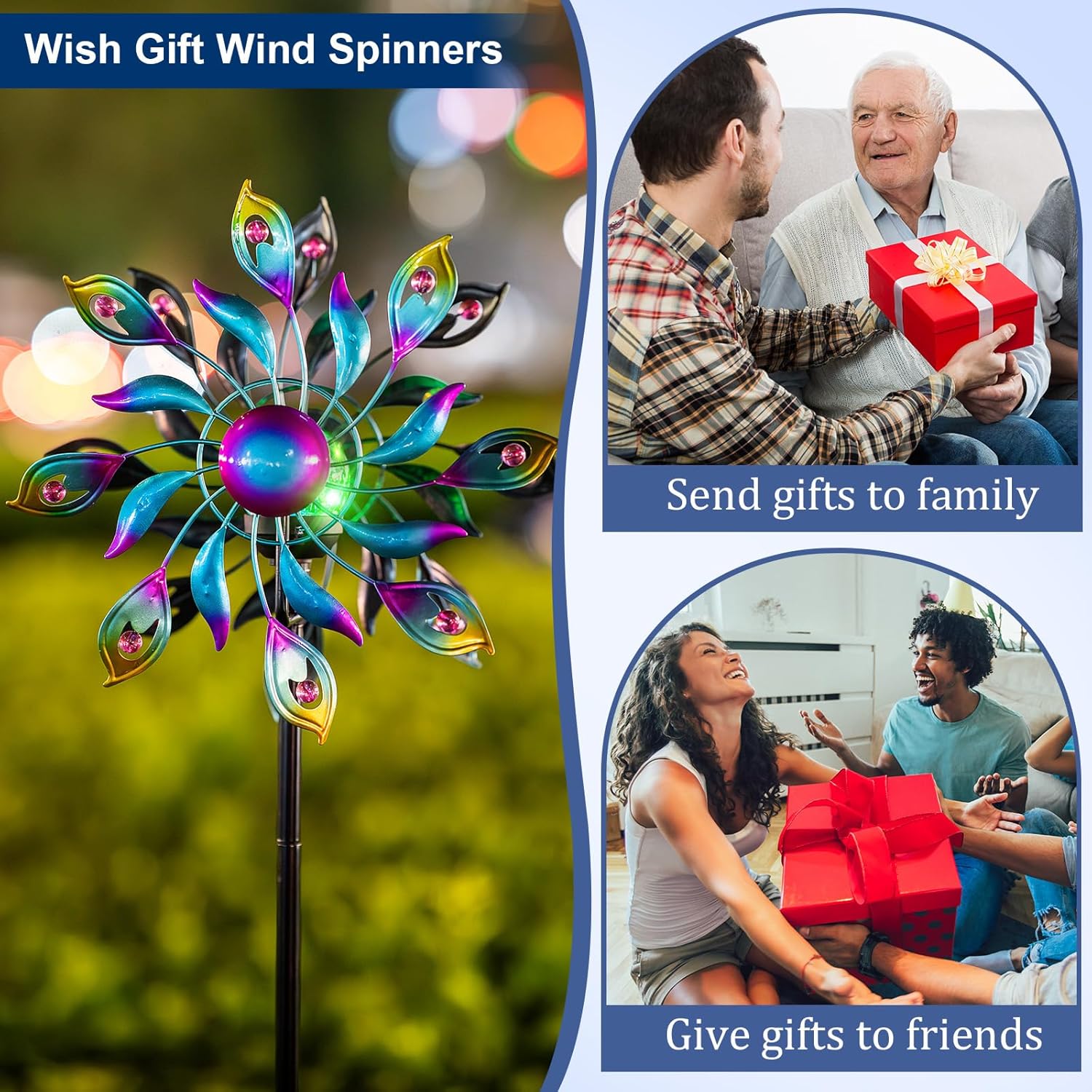 - Solar Wind Spinner: Featuring a solar-powered color-changing LED burst glass globe light that provides a jewel-like soft light for your garden at night. It combines the beauty of a wind spinner with the functionality of solar power, providing a captivating display of spinning motion while giving your garden a unique charm!
