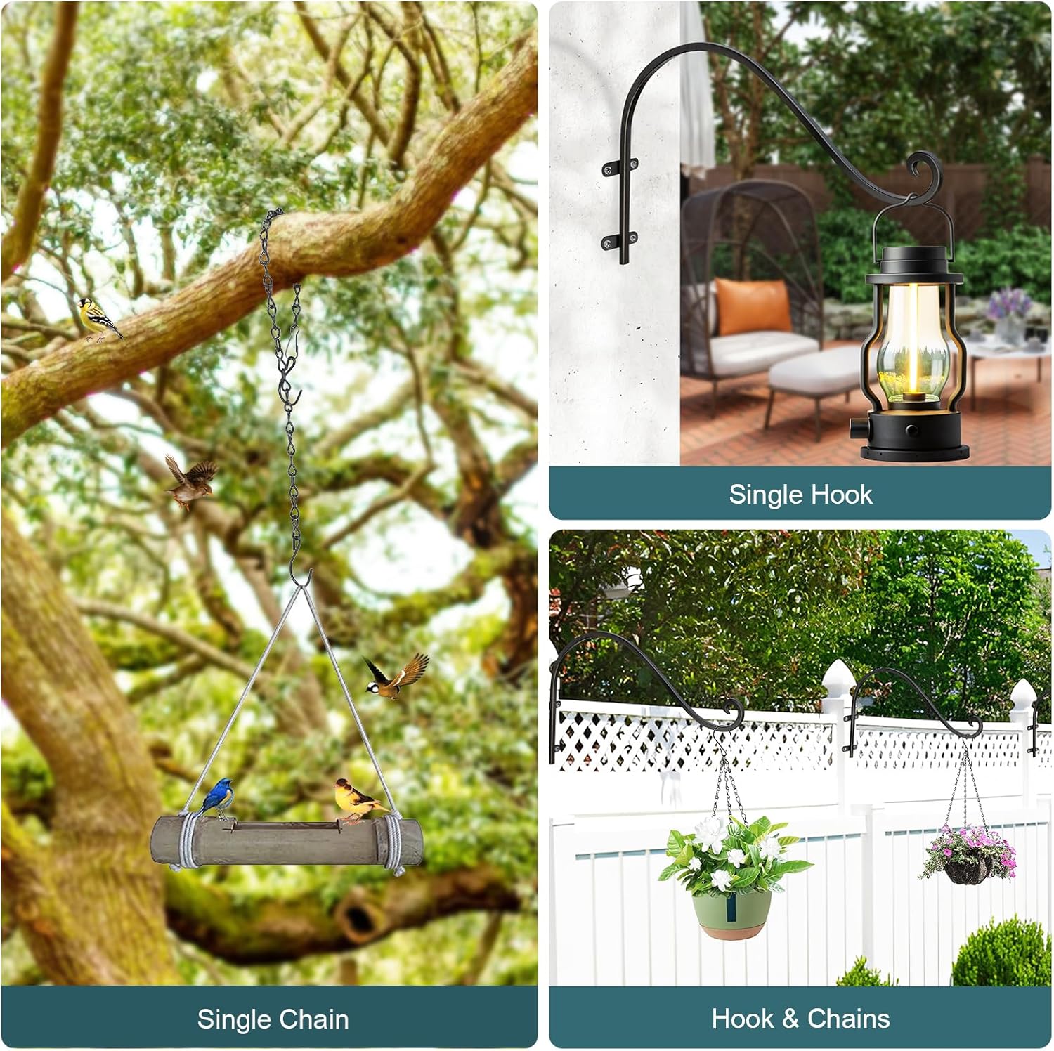 - 【DIY & Multiple Uses】 Three uses. (1) Use the hanger separately. (2) Pair the hanger with the chain. (3) Use the hanging chain separately. You can shorten or extend the chain, or try brushing it with a nail polish or coating to turn it into another color you like. Hanging plant brackets can be widely used for hanging flower pots, bird feeders, bird houses, lanterns, wind chimes, billboards, blackboards, and are good decorations for living rooms, porches, terraces, gardens, backyards, etc.