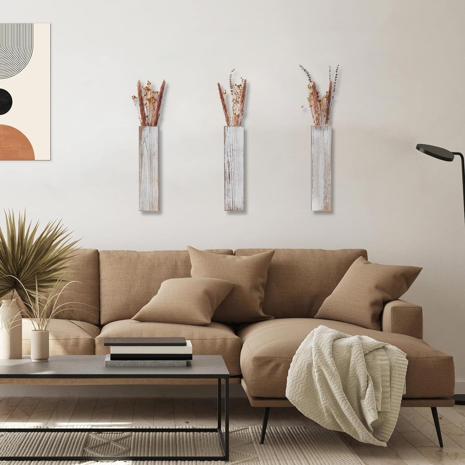 Wooden Wall Planter Set of 3 - Modern Home Decor for Living Room, Bedroom, Bathroom - Vintage Finish Planter for Dried Flowers, Faux Greenery, Indoor Plants