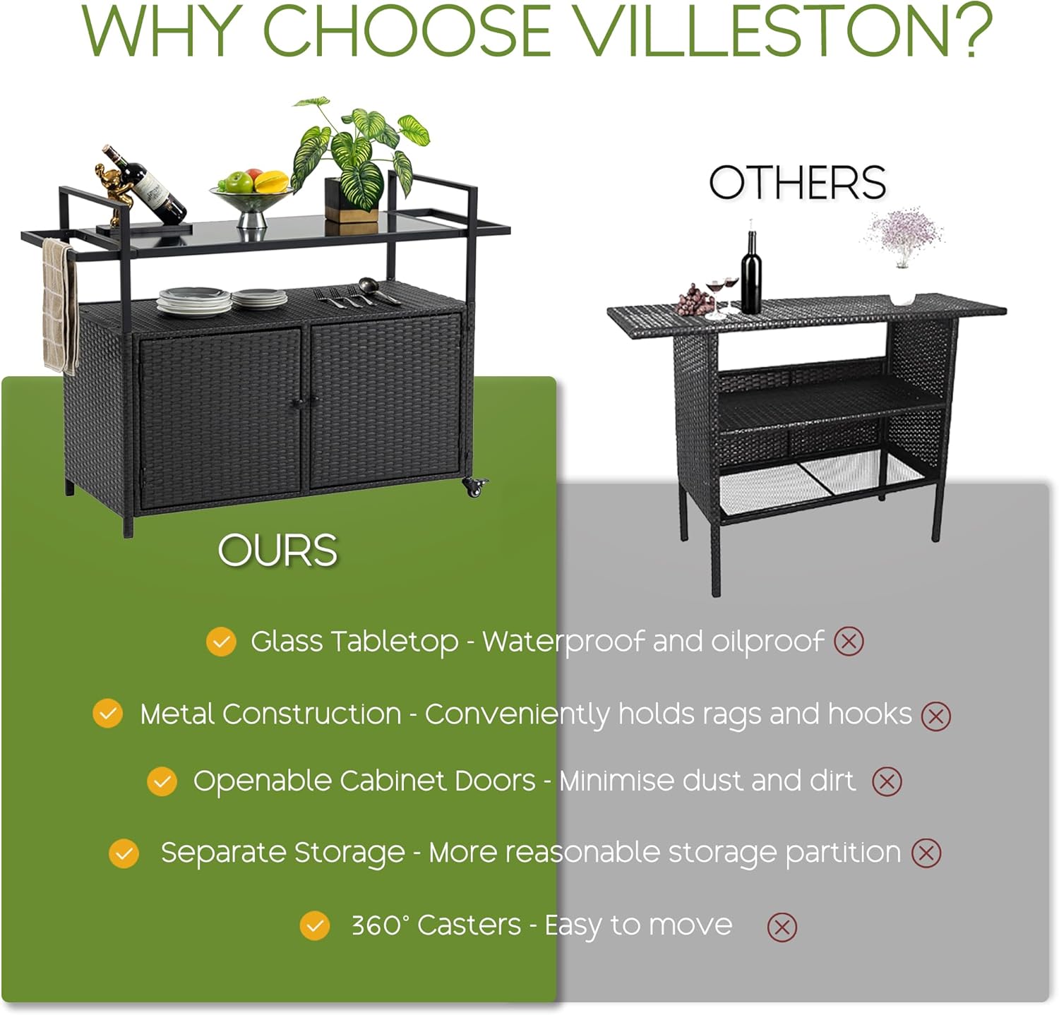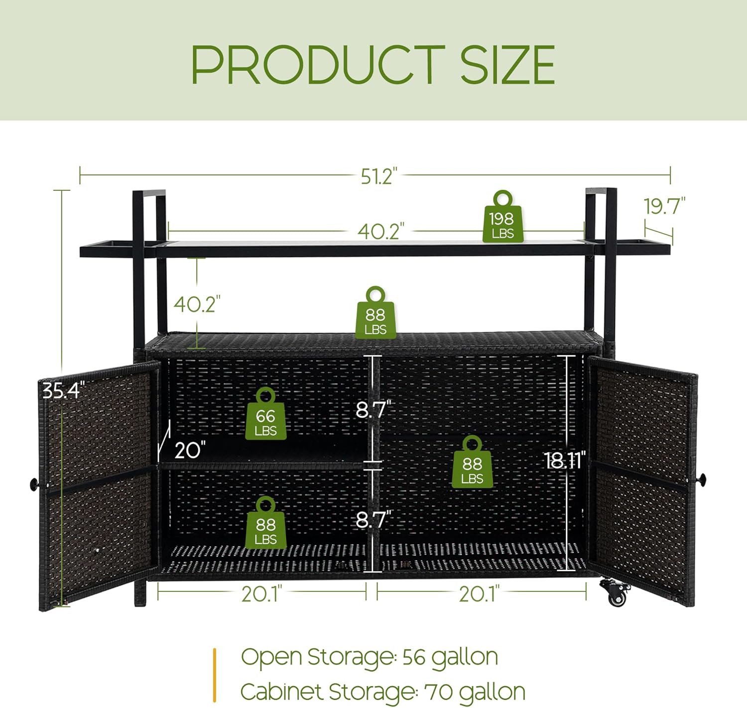 - ALL-SEASON USE: Crafted with UV-resistant and waterproof wicker, this patio bar cart withstands sun exposure, rain, and changing weather conditions. Whether used as an outdoor storage cabinet, a bar station, ensuring both stability and durability