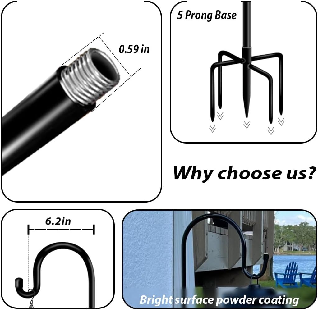 - EXCELLENT QUALITY: The free-standing bird feeders hanger come with 5 Base Prongs, provides with a strong grip and high stability. In the meantime, they are made of heavy duty metal pipes with bright surface powder coating, which is rust-free, water-proof when used outdoors and durable for lasting long service life.