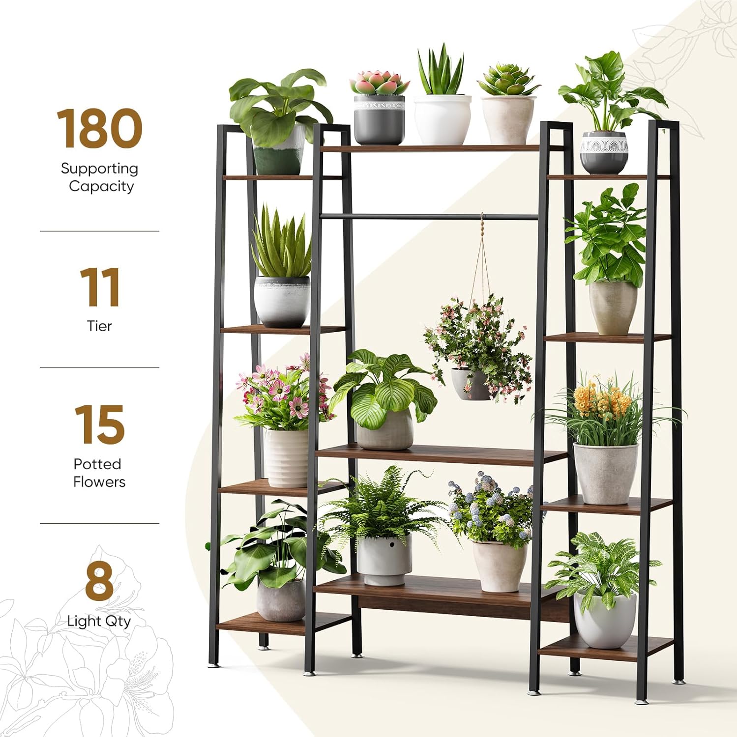 - 【Expandable 12-Tier + Hidden Storage】12 adjustable shelves (20% more than 6-tier stands) hold 30+ plants. Removable tier converts to tool storage or display space for books/art. Matte walnut finish resists water stains.