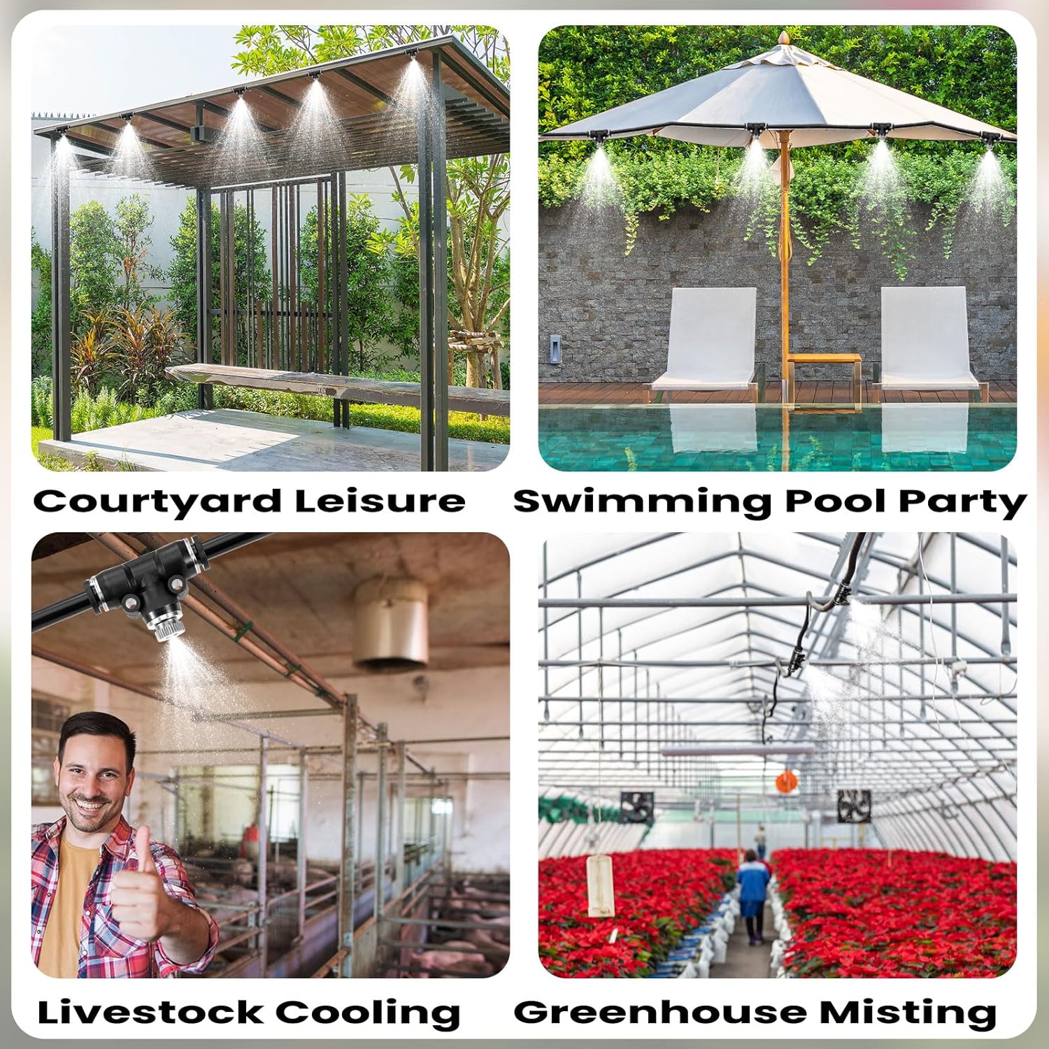 - 【Ideal for Multiple Uses】Stay cool in hot summer with these misting nozzles.These misting nozzles are perfect for creating a refreshing outdoors play area for humans,providing cooling for pets during the summer heat, or adding a cool mist around your pool for a refreshing swim experience