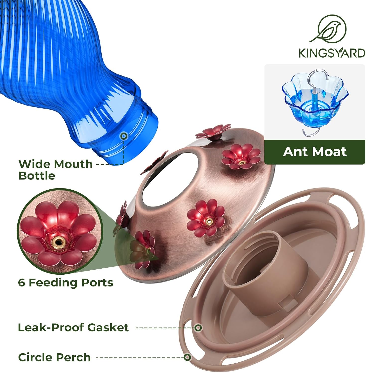 Kingsyard Glass Hummingbird Feeders for Outdoors, 24 oz Hummingbird Nectar Feeder for Outdoors Garden Yard Décor, 6 Feeding Ports, Ant Moat Included, Easy to Clean & Refill, Navy Blue