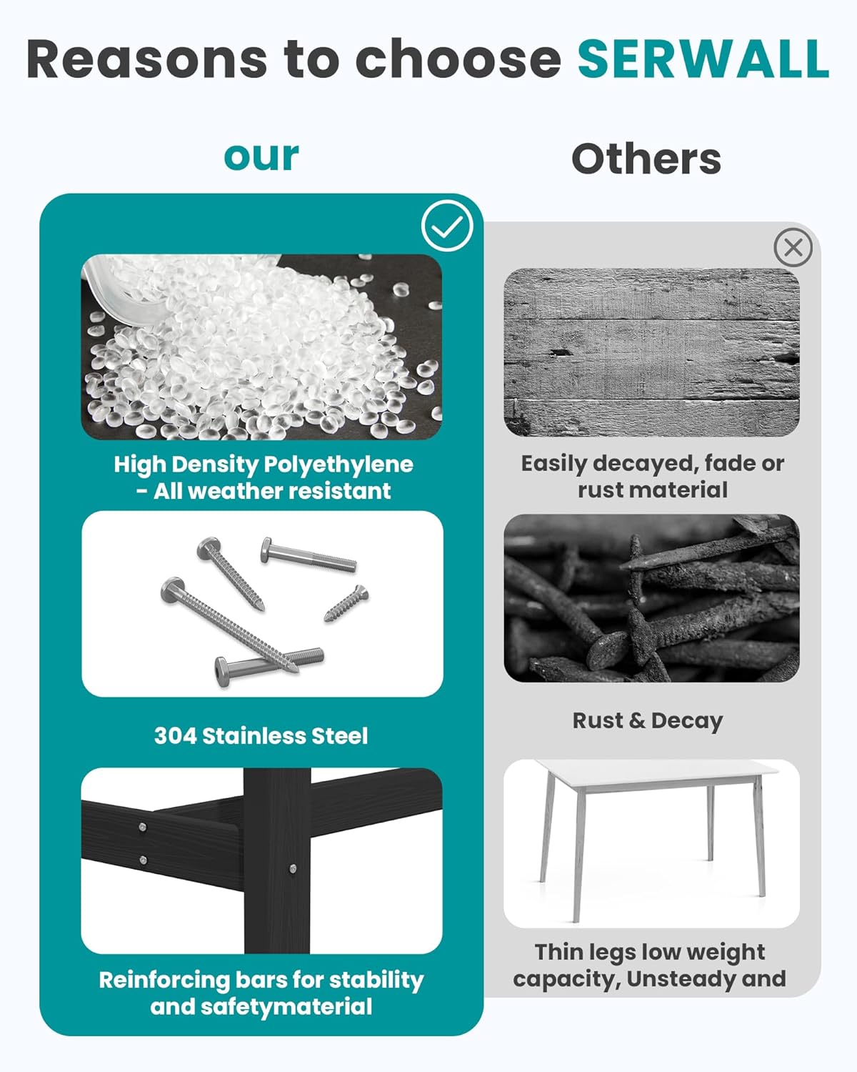 - Sturdy and Durable: Serwall outdoor furniture crafted from recyclable HDPE (High-Density Polyethylene), this material is built to withstand extreme weather conditions, including intense sun, freezing temperatures, strong winds, and heavy rain, all while maintaining its original color.