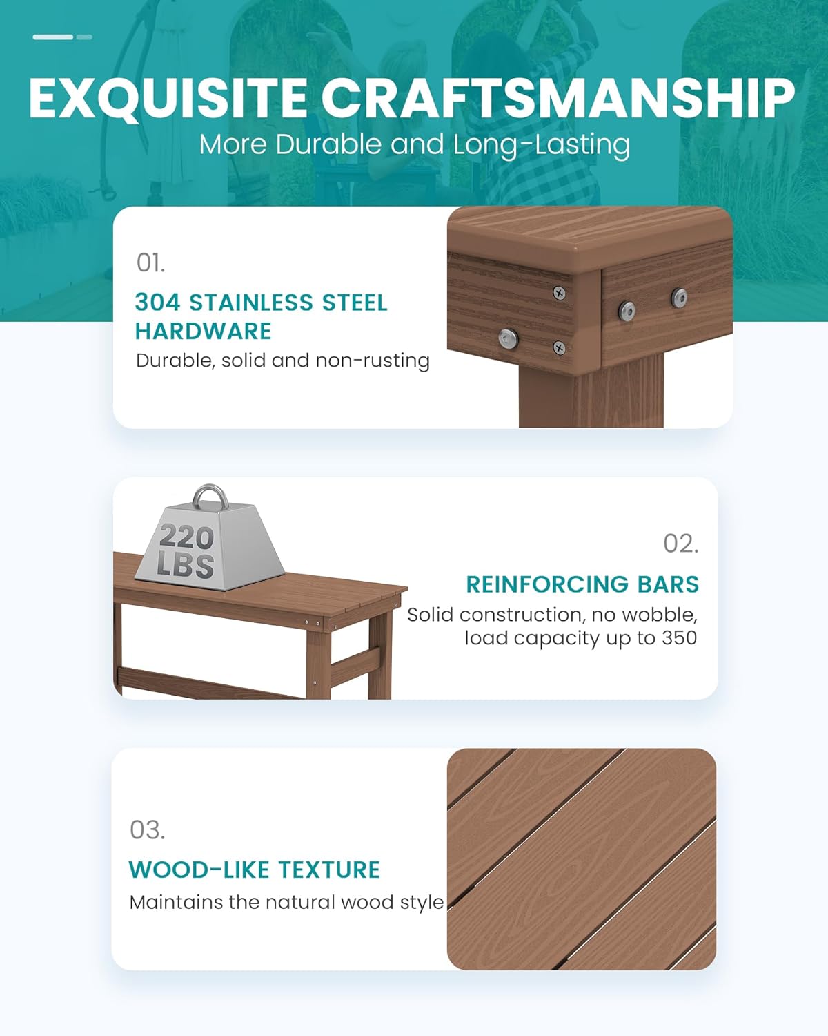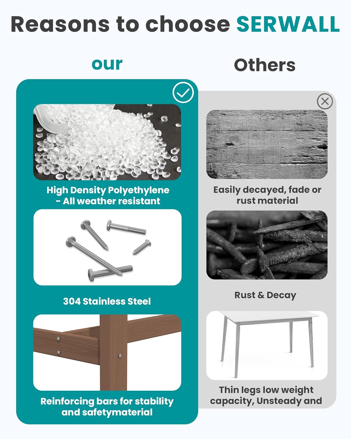 - Sturdy and Durable: Serwall outdoor furniture crafted from recyclable HDPE (High-Density Polyethylene), this material is built to withstand extreme weather conditions, including intense sun, freezing temperatures, strong winds, and heavy rain, all while maintaining its original color.