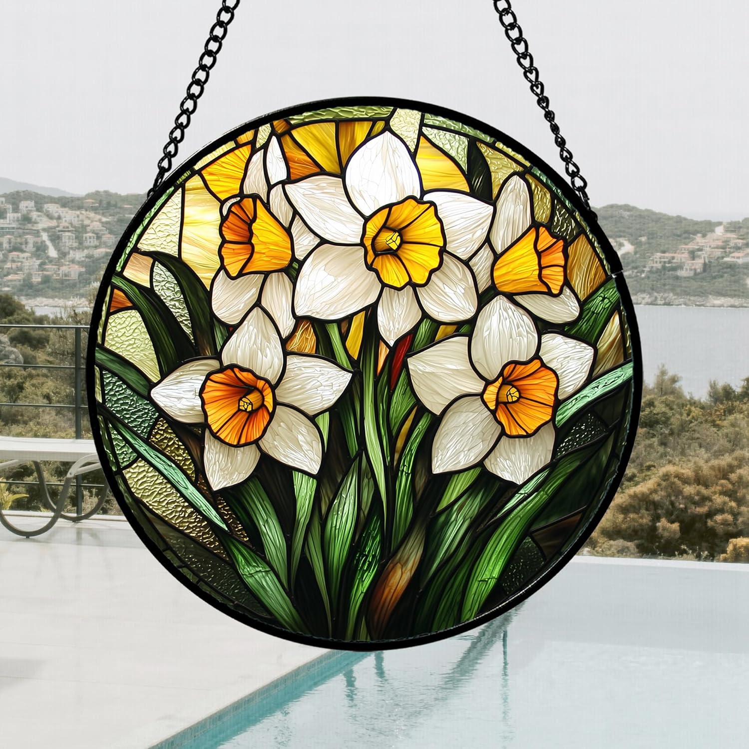 Stained Glass Window Hanging, Yellow and White Daffodils Sun Catcher for Door Home Decor Plants Flowers Suncatcher Christmas Mother's Day Birthday Gifts for Women Men Mom Nana 9.8 in