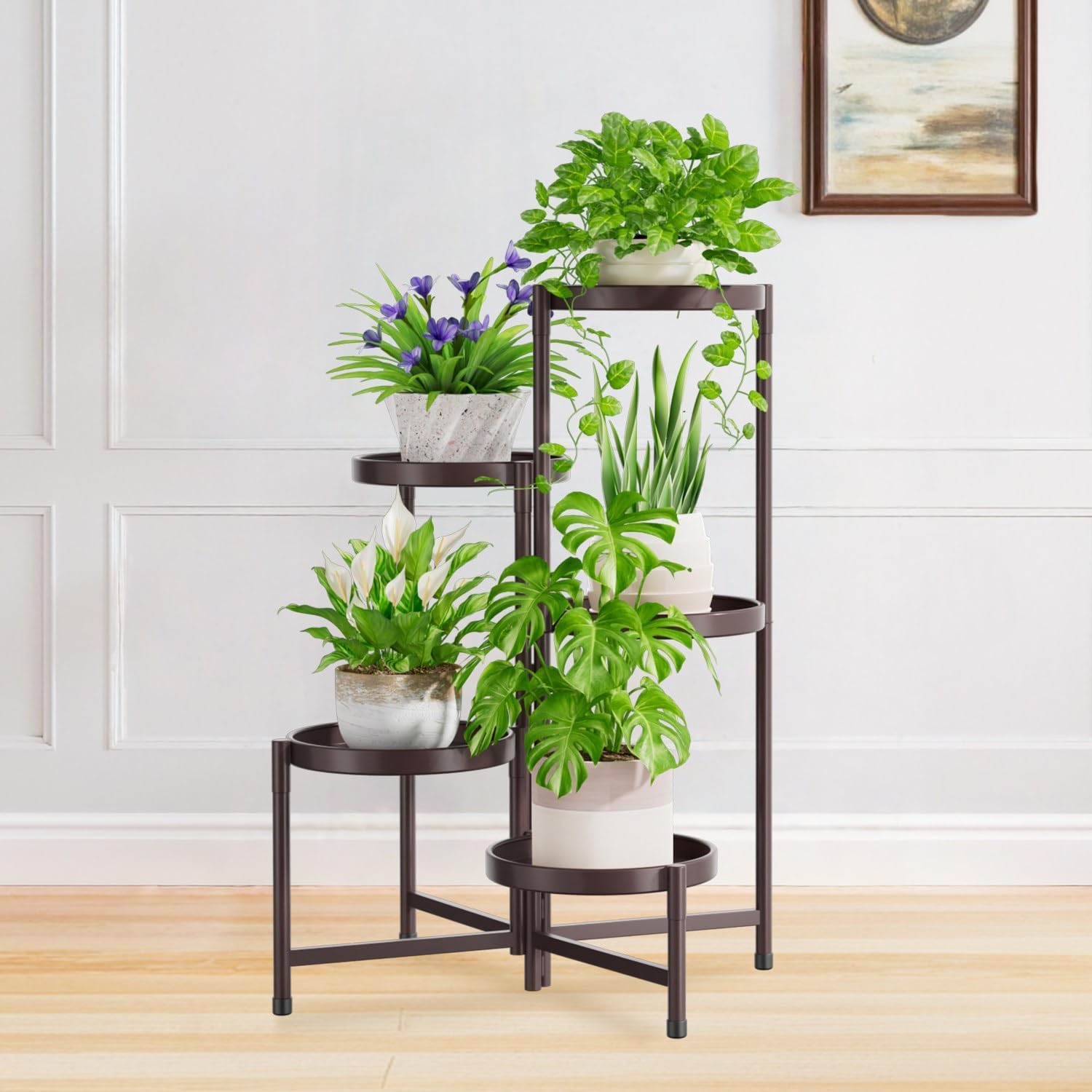 - Unique Modern Style Holder: The 5 tier plant stand is designed with a unique spiral tiered structure that can hold up to 5 pots without blocking each other, so that each of your plants can fully enjoy the sunlight. Modern and classic in style, this outdoor plant stand is perfect for decorating balcony, porch, garden, patio, window and office