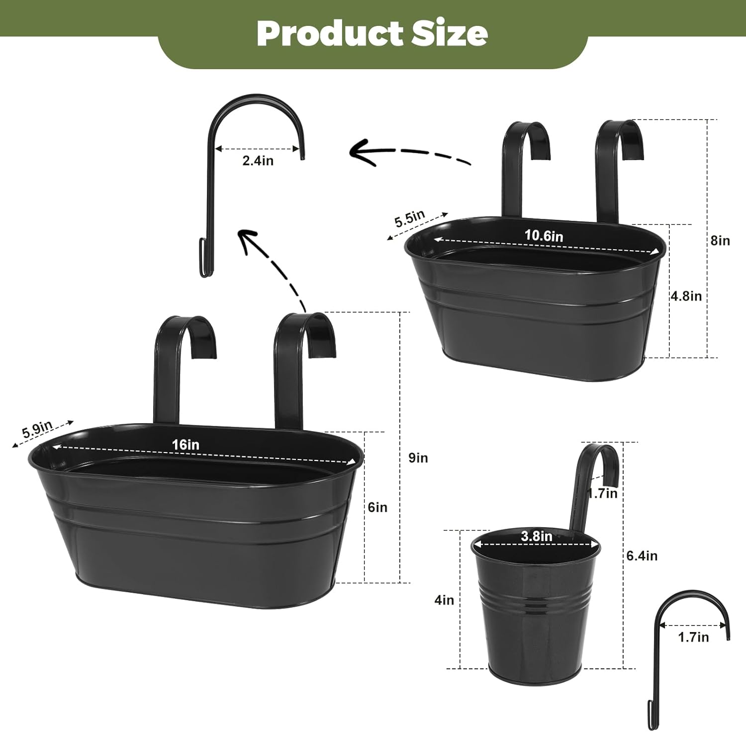 - 【SIZE DETAILS】Each set of Railing Flower Baskets contains 3 large flower baskets with dimensions of 16 "x5.9" 6 ", 3 medium-sized flower baskets with dimensions of 10.6 "x5.5" x4.8 ", and 4 small flower baskets with dimensions of 3.8 "x3.8" x4.0 ".The Flower Basket Hook is included in the package and is very easy to install.