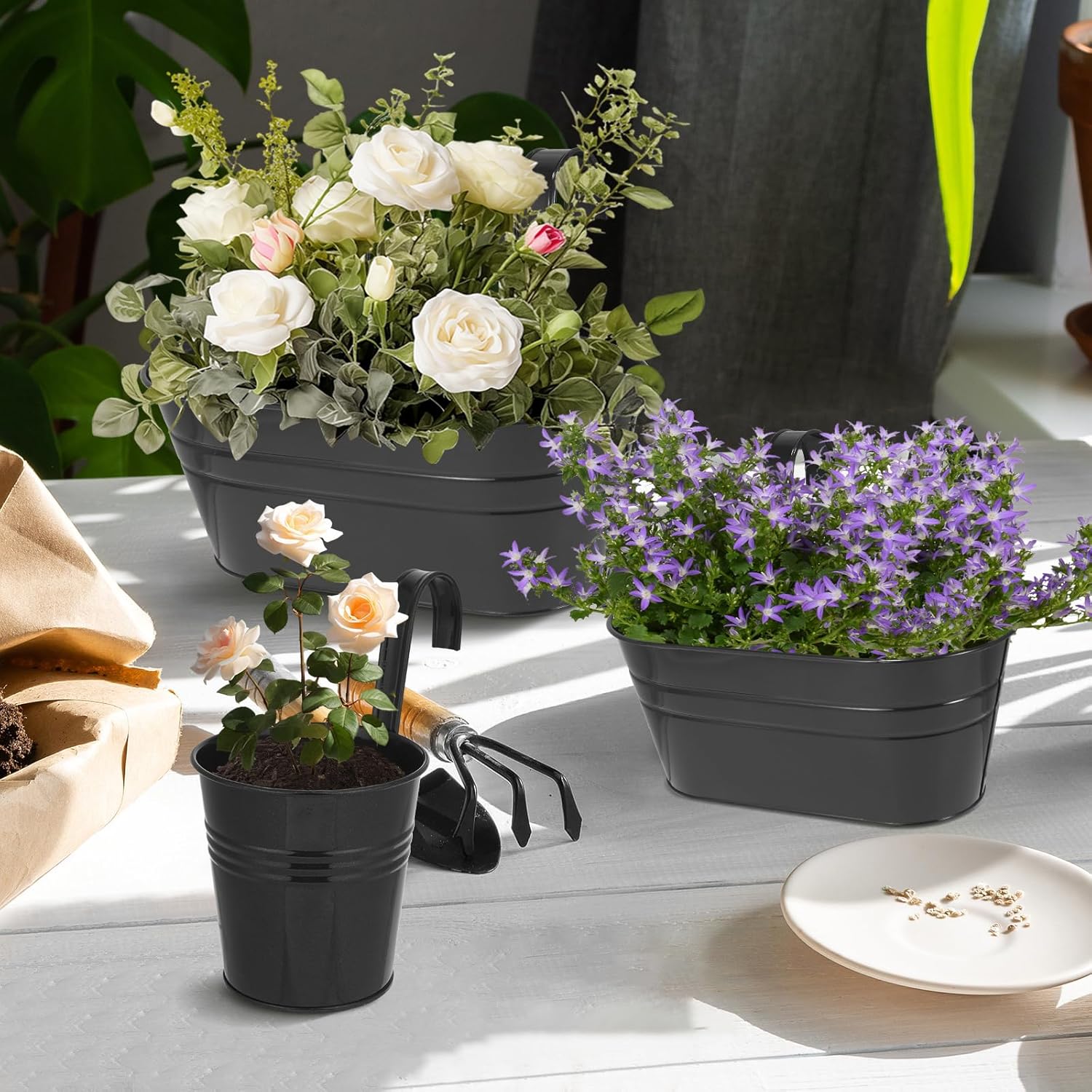 - 【Decorate Home】Metal Hanging Flower Pots allow you to decorate your home anywhere. They can be hung on outdoor or indoor railings, walls and fences, and are suitable for desktops, yards, balconies, front verandas and garden racks, bringing vitality to your home.