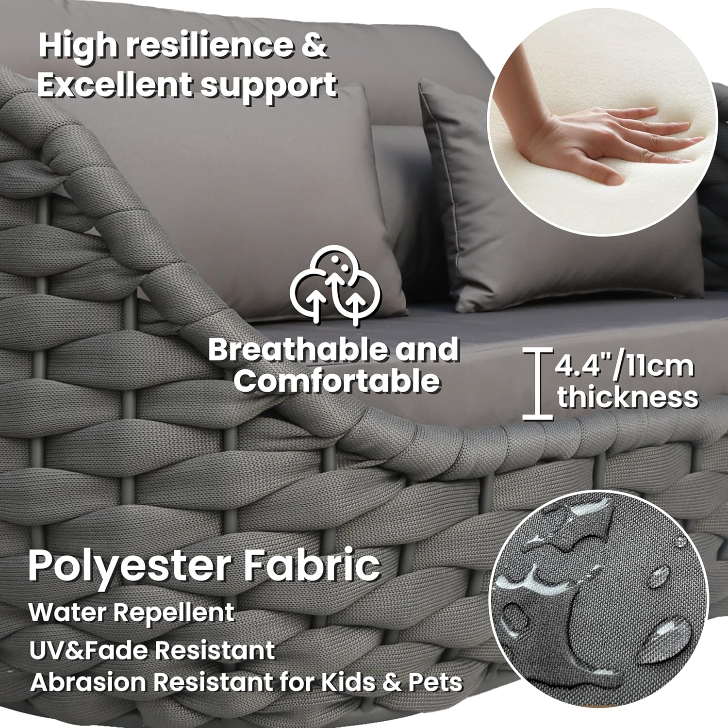 Aluminum Outdoor Seating Set: 5 Pieces Woven Rope Patio Furniture Conversation Set - Modern Deck Loveseat Set Cushioned - Assembled Metal Porch Lounge Set for Yard Garden Lanai Hotel, Dark Grey