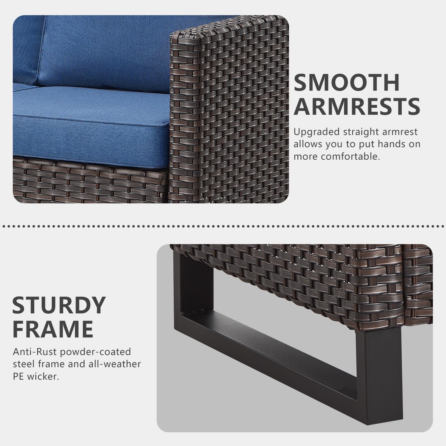 - 【Upgrated Elegant Design】All made with Anti-Rust powder-coated steel frame and All-weather Hand-Woven PE wicker to make this patio furniture set is resistant to UV and weather,The patio conversation sets is totally upgraded with straight armrest and the heightened ergonomically curved backrest.