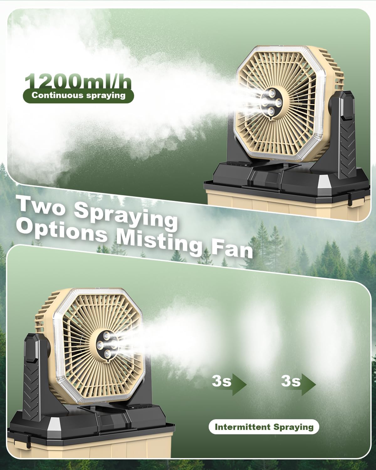 - ă8L super capacity+dual mode intelligent sprayă The Camping Bucket Mist Blower comes with an extra large 8L water tank. A single fill of water can support at least 6 hours of continuous spraying! It can be freely switched between continuous spraying or intermittent spraying, adapting to scenes such as courtyards, construction sites, etc., creating a professional outdoor spray fan experience!