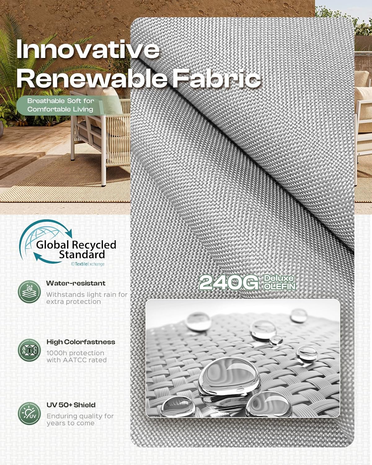 - 【Durable Design】 The modern outdoor furniture features a superior aluminum frame that is far stronger and more durable than typical metal frame. And the anodized finish enhances durability and stability. The Olefin fabric combines durability with UV protection for years of outdoor enjoyment. The HDPE handcrafted rope has exceptionally high strength, offering greater load-bearing capacity than regular wicker, setting it apart from other wicker outdoor furniture.