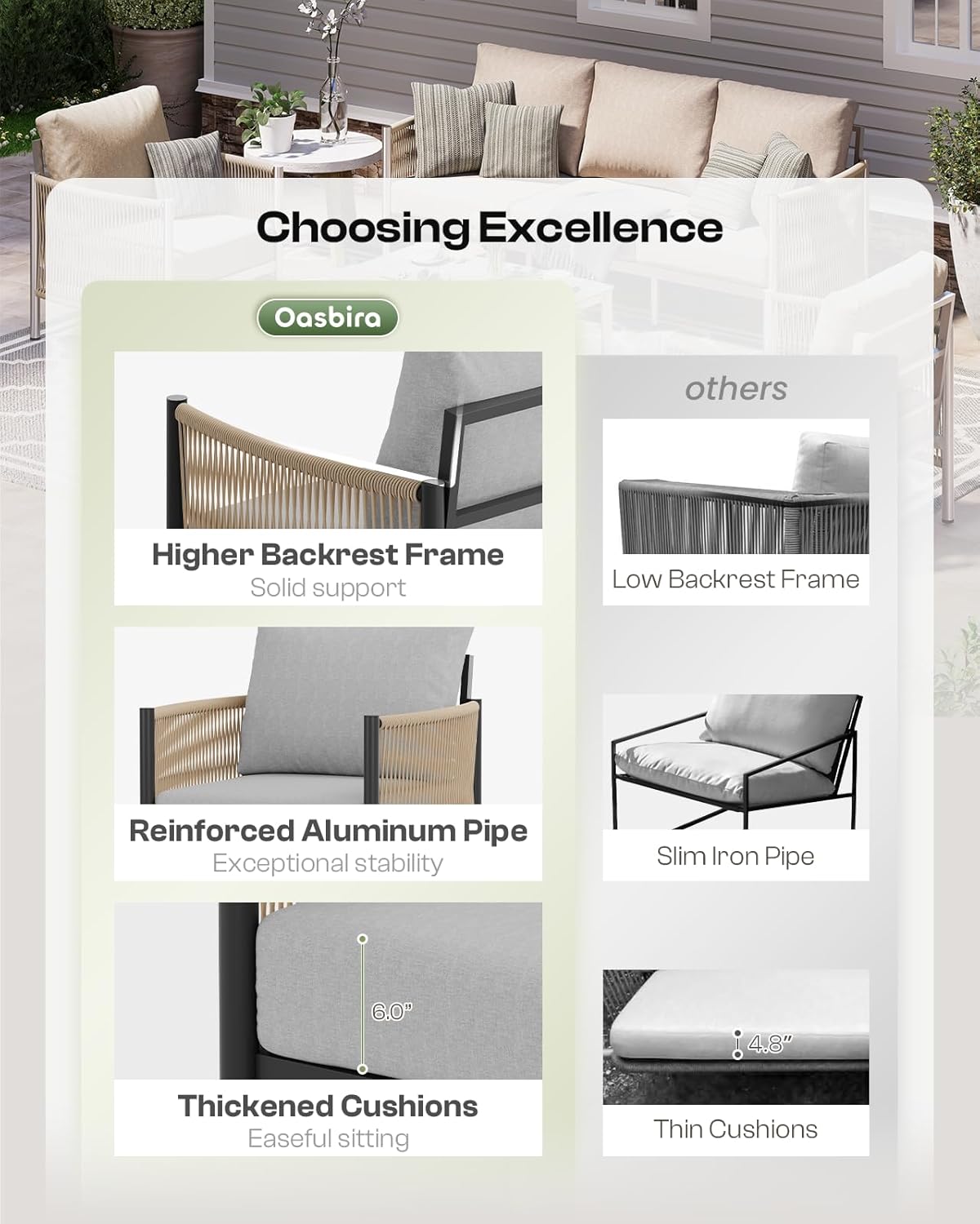 - 【Ultimate Comfort】 The cushions of the Oasbira patio furniture set are filled with honeycomb structure foam, offering exceptional comfort. This outdoor seating furniture features an elevated backrest frame reaching 29.4 inches, providing support that far beyond average patio sets. Each seat is 23.6 inches wide, offering ample space and ensuring ergonomic relaxation.