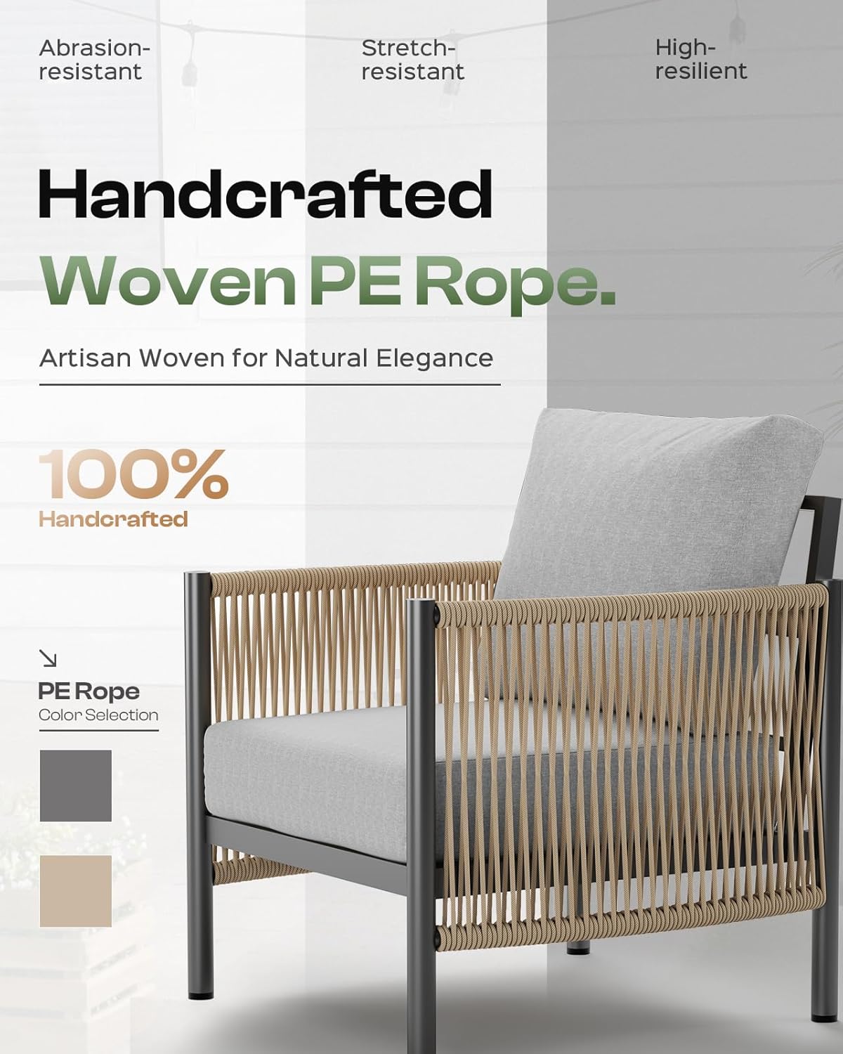- 【Durable Design】 This modern outdoor furniture features a high-strength aluminum frame that is far stronger and more durable than typical metal frame. The powder-coated surface enhances weather resistance. The Olefin fabric combines durability with UV protection for years of outdoor enjoyment. The HDPE handcrafted rope has exceptionally high strength, offering wear resistance and a longer lifespan compared to traditional wicker, setting it apart from other wicker outdoor furniture.