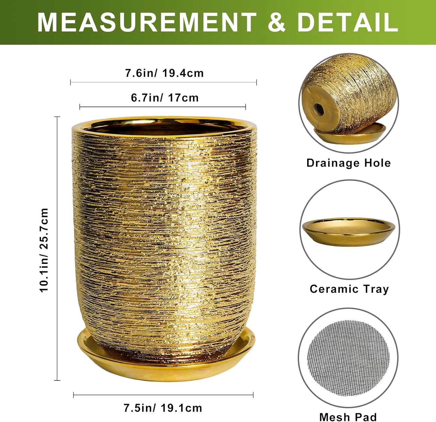 - Size of Ceramic Plant Pot: Each gold planter is 7.6” in outer diameter and 10.1” in height. The optimal size makes plant pot an ideal home for planting cactus, monstera, money tree, ficus lyrata, olive tree, succulent