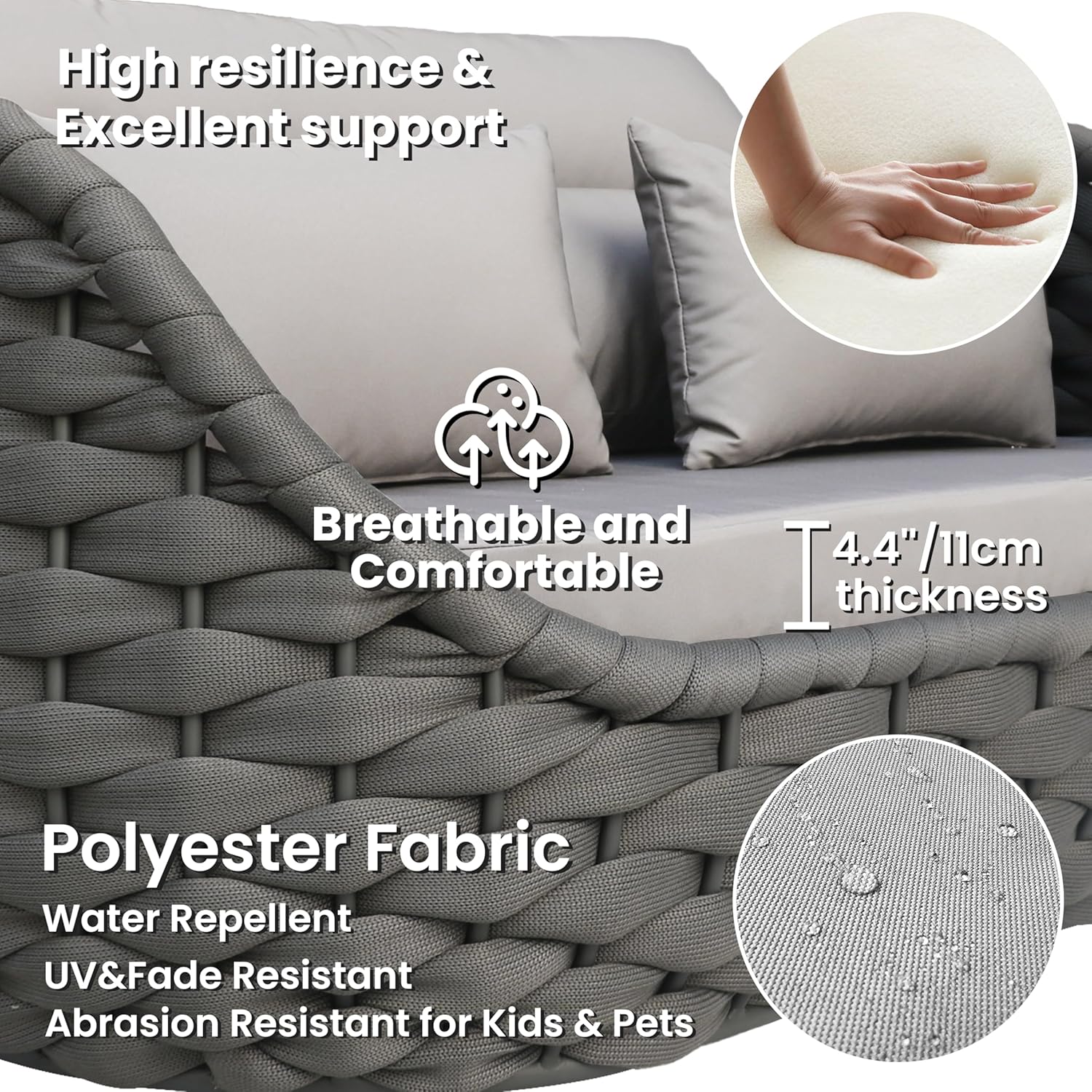 - Filled with 4.3"/11cm thick high-density foam and cotton, cushions are soft touching and breathable for a refresh comfy outdoor seating holding its shape in long time using. Water repellent and abrasion resistant polyester fabric also fits families with kids and pets