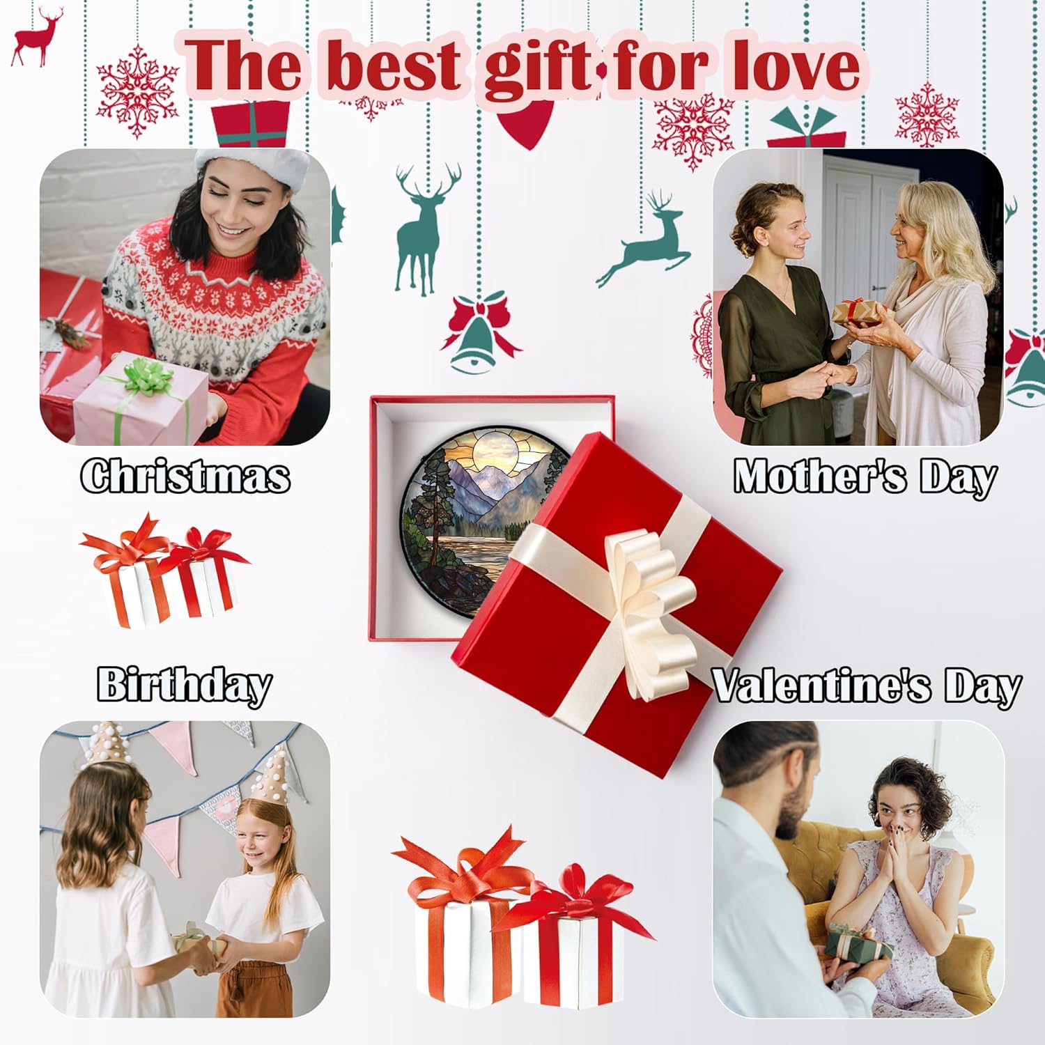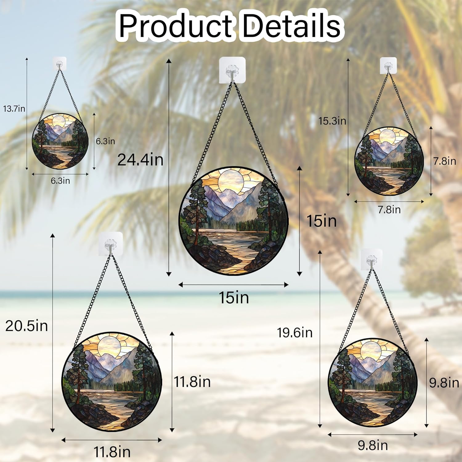 Stained Glass Window Hanging, Sunset Mountains Lake Tree Sun Catcher for Window Home Decor Landscape Suncatcher Mother's Day Birthday Gifts for Women Men Mom and Nana 6.3 in